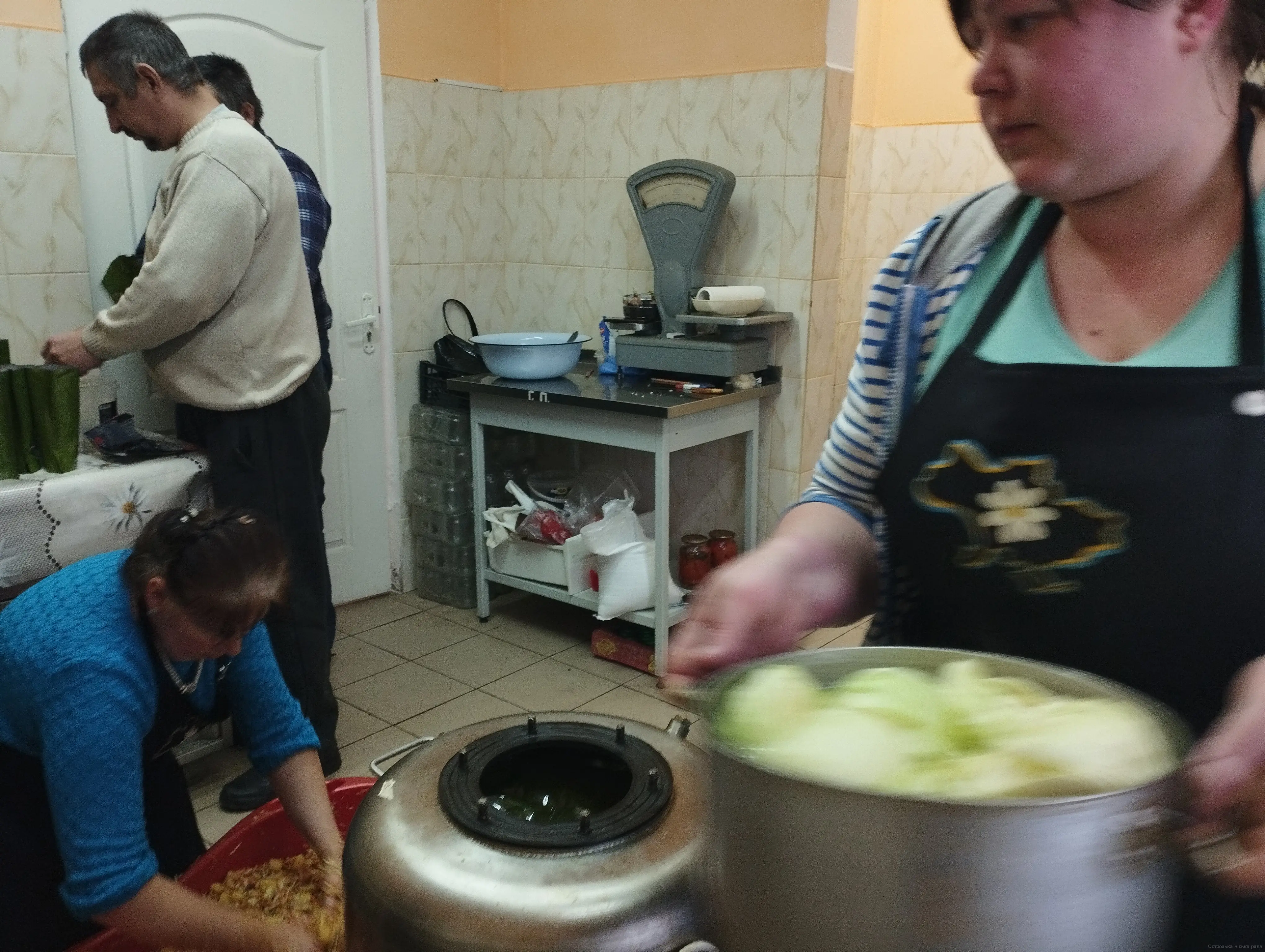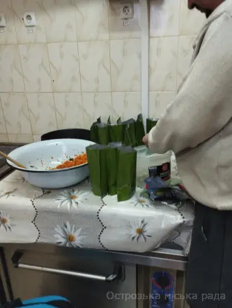Згодом почали робити випічку, картоплю, ліниві голубці, квашену капусту(пересікли 4  тонни капусти). Пізніше до нас долучилася Лариса Хазієва. Вона разом з дівчатами з ДПТНЗ «Острозьке ВПУ» готують усе з борошна: печуть печиво, пиріжки, ліплять вареники.За день випікають для військових близько 50 кілограм печива та ліплять 11 п’ятилітрових відер вареників.