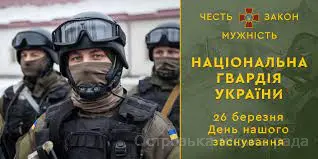26 березня наша Держава відзначає національне свято – День Національної гвардії України! У цей складний для нашої країни час, щиро вітаю усіх військовослужбовців, добровольців і патріотів, які у лавах Національної гвардії України стоять на захисті народу, цілісності і суверенітету нашої держави.