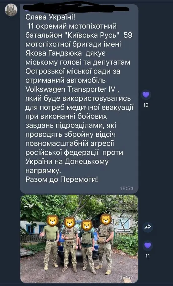 Автомобіль, який Острозька міська рада передала нашому земляку вже на передовій.