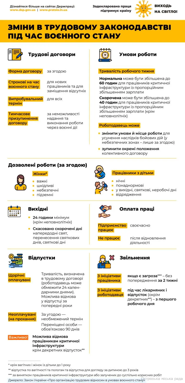 З метою забезпечення зростання кількості осіб, охоплених соціальним страхуванням, з урахуванням Національного плану зниження рівня незадекларованої праці на 2023 рік, Західне міжрегіональне управління Державної служби України з питань праці проводить інформаційну кампанію «Виходь на світло!» в частині «Зміни в трудовому законодавстві під час воєнного стану».
