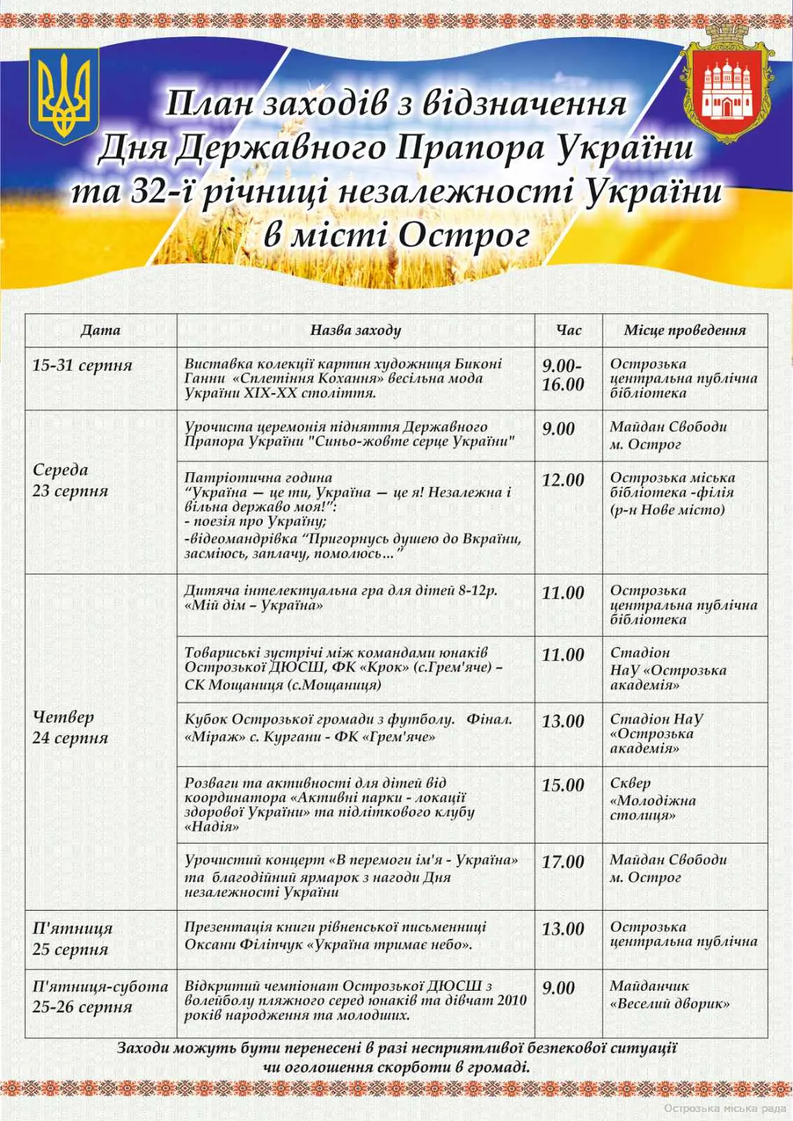 Шановні жителі та гості громади!Запрошуємо Вас взяти участь у заходах приурочених відзначенню Дня Державного Прапора України та Дня Незалежності України!
