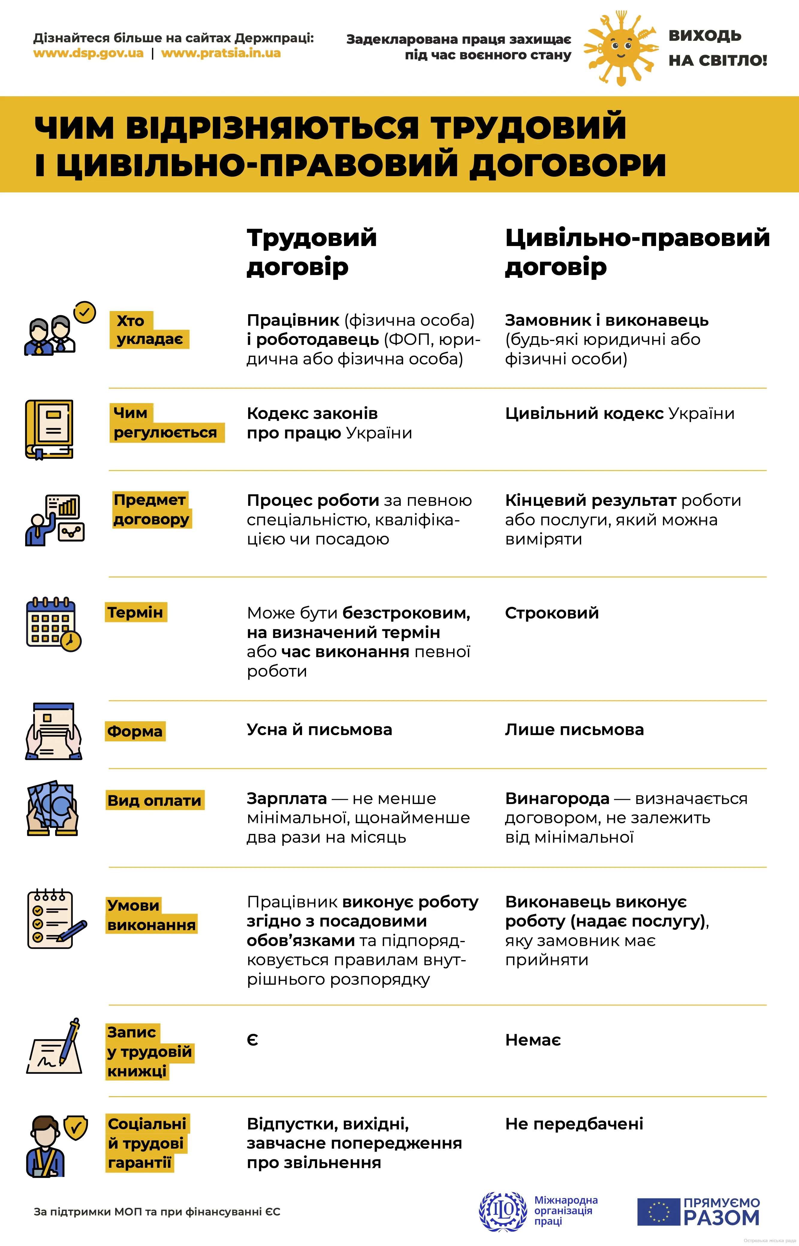 Управління інспекційної діяльності у Рівненській області Західного міжрегіонального управління Державної служби з питань праці в рамках інформаційної кампанії «Виходь на світло!» надає інформаційні матеріали в частині «ЧИМ ВІДРІЗНЯЮТЬСЯ ТРУДОВИЙ І ЦИВІЛЬНО – ПРАВОВИЙ ДОГОВОРИ»