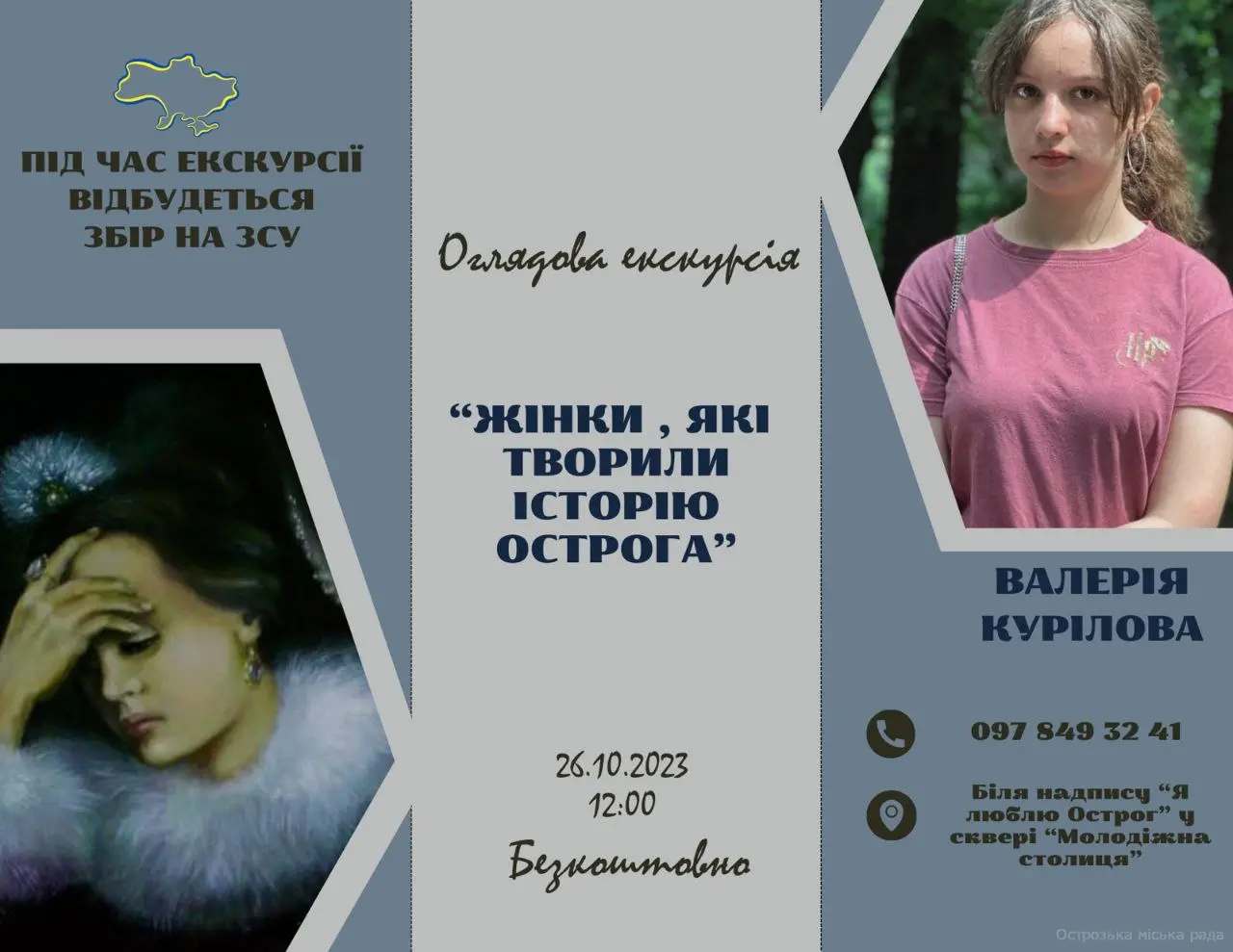 26 жовтня 2023 року (четвер), Валерія КУРІЛОВА випускниця проєкту "Школа туристичного волонтерства", проведе свою першу особисту оглядову екскурсію «Жінки, які творили історію Острога».