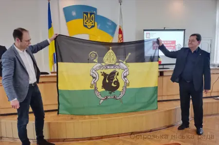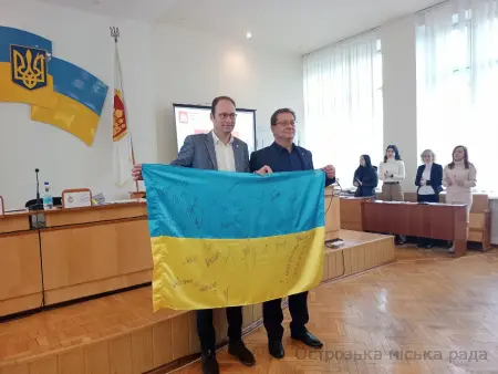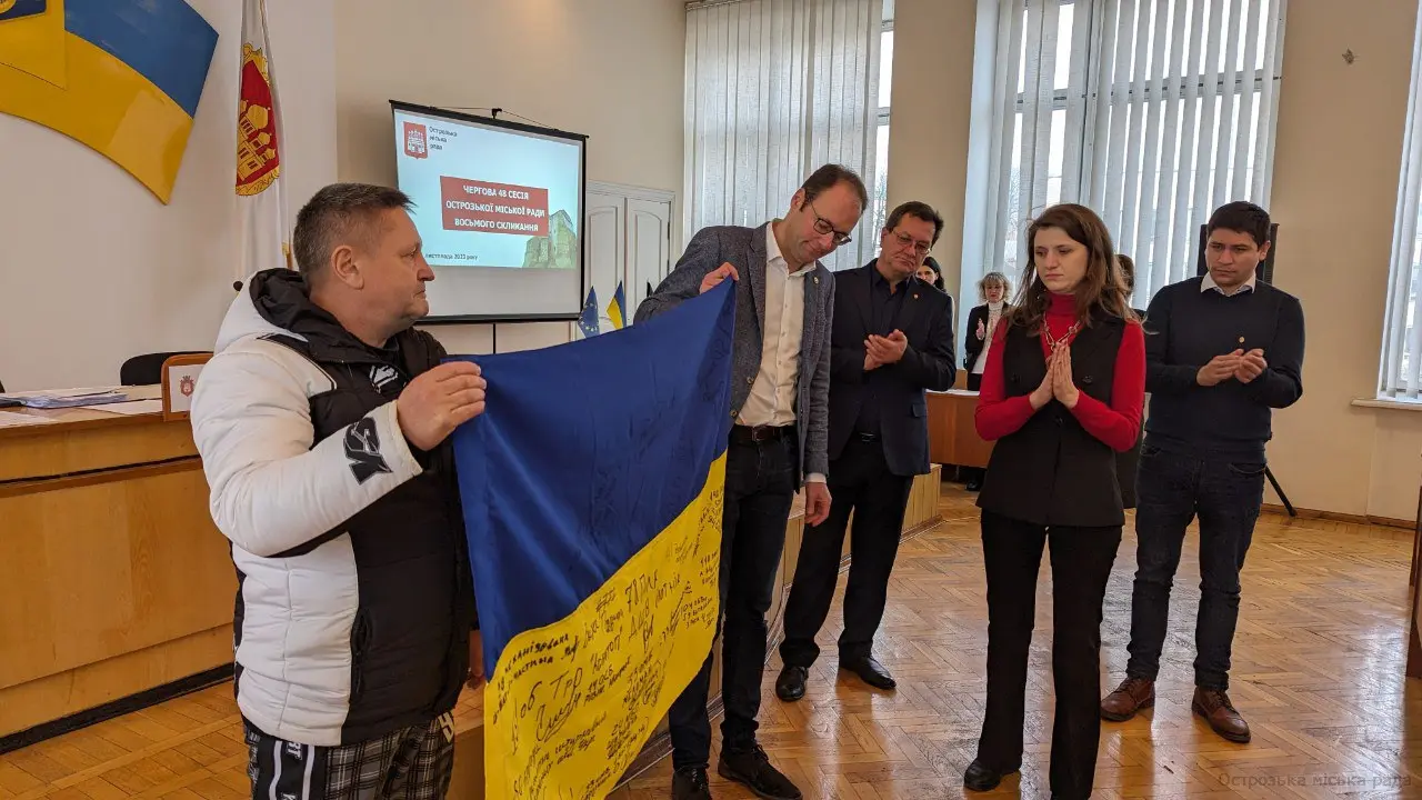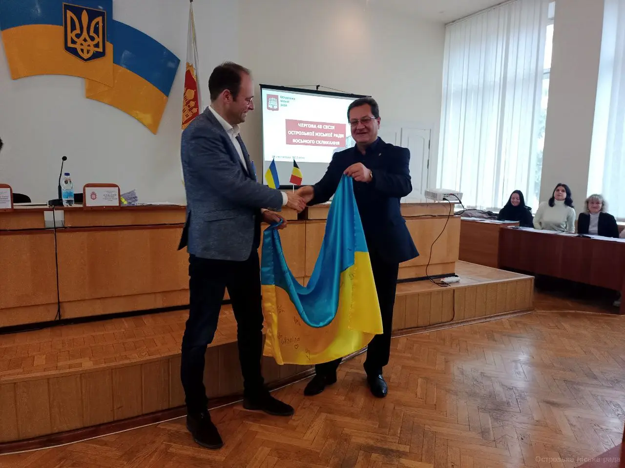 Міський голова Юрій ЯГОДКА, в знак вдячності передав делегації символічний Державний Прапор України з підписами острозьких депутатів для міста Мальмеді та висловив подяку за допомогу нашим воїнам, жителям нашої громади. Василь Юзепчук, теж долучився до вручення подарунків бельгійській делегації і вручив їм Державний Прапор України з підписами наших острозьких військових, котрі на даний час не всі лишилися живими. Мер міста Мальмеді теж подарував їхній прапор для Острозької громади в знак пошани та співпраці.
