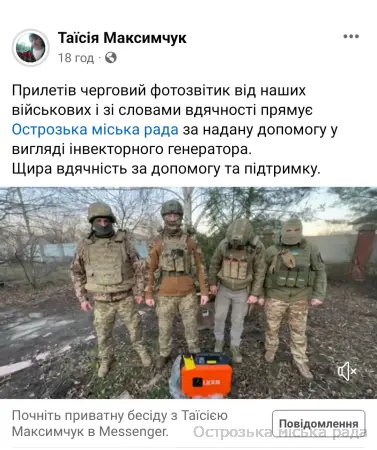 Днями волонтери звернулися до Острозької міської ради з потребою від військових. Українським захисникам на фронт був потрібний генератор. Міська рада виконала прохання бійців.