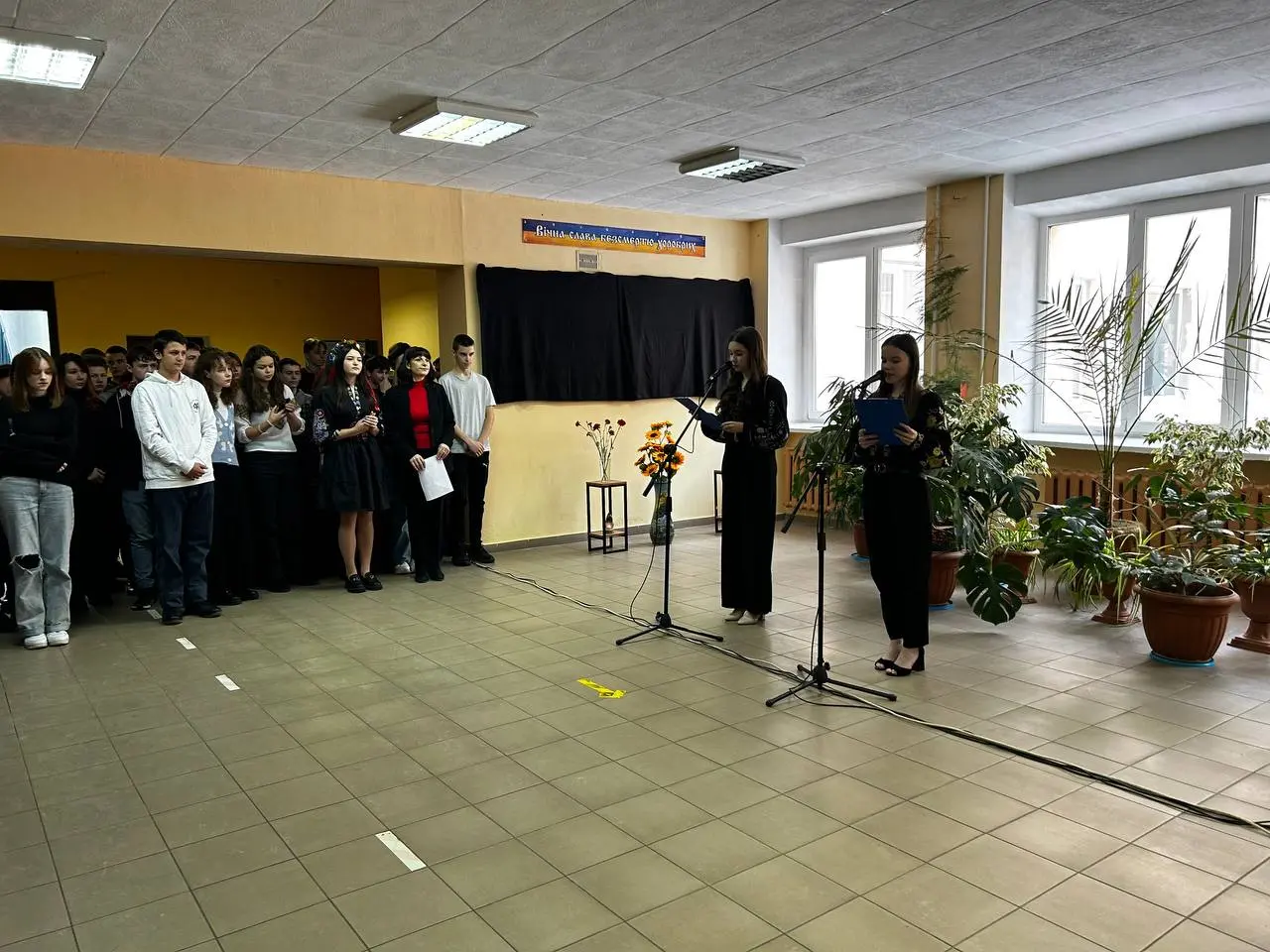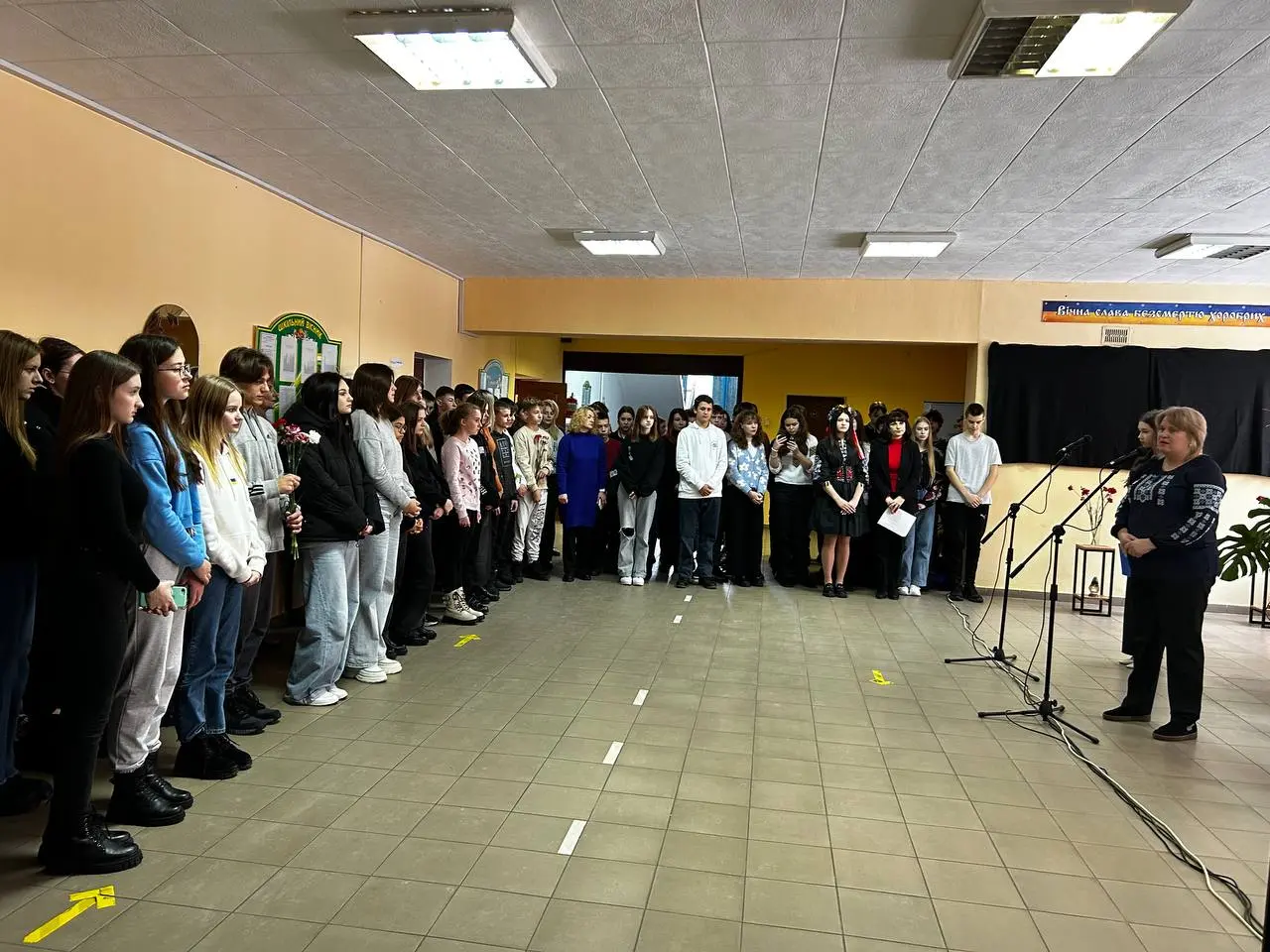 Віддати шану загиблим захисникам-героям прийшли учні, педагоги та запрошені гості: Олександр ХАРЧУК, заступник міського голови, Андрій ШЕВЧУК, начальник Управління освіти, молоді та спорту виконавчого комітету Острозької міської ради, які схилили низько голови перед пам’яттю і подвигом славних синів України, що загинули в ім’я життя інших, у ім’я спокою і миру на українській землі.