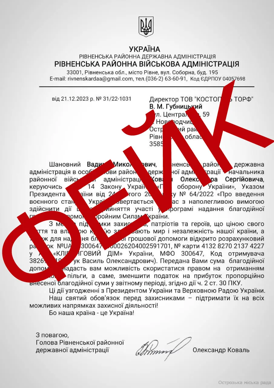 Просимо звернути увагу та бути обережними щодо недостовірних повідомлень, які можуть надходити на ваші електронні адреси. Зокрема, розсилки, які неправомірно використовують ім'я голови Рівненської районної державної адміністрації - начальника Рівненської районної військової адміністрації Олександра Коваля, з метою збору благодійної допомоги для Збройних Сил України, є ФЕЙКОВИМИ.