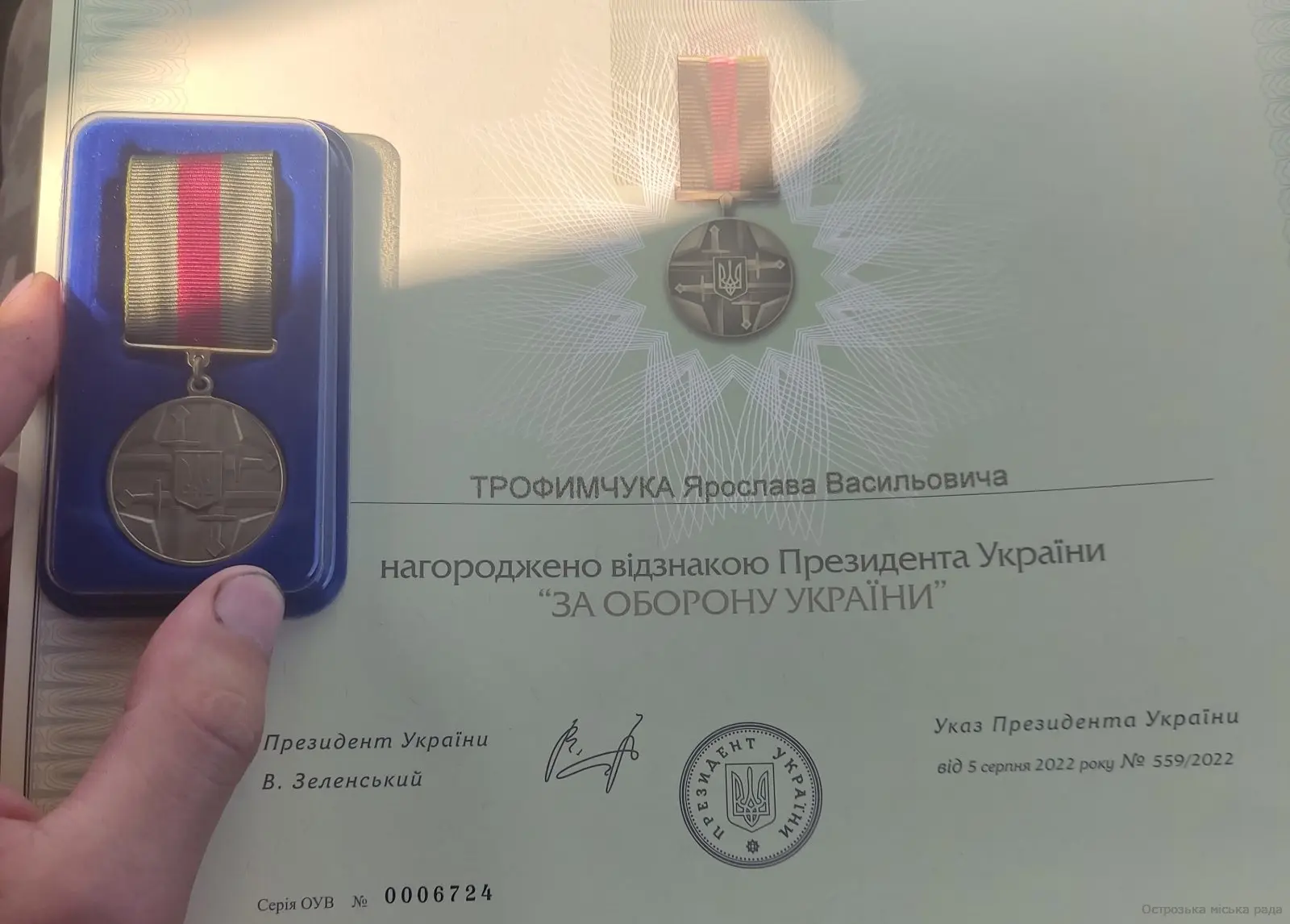 За здійсненні заходи із забезпечення оборони України, захисту безпеки населення та інтересів держави у зв'язку з широкомасштабною збройною агресією російської федерації проти України Ярослава було нагороджено відзнакою Президента України "За оборону України".