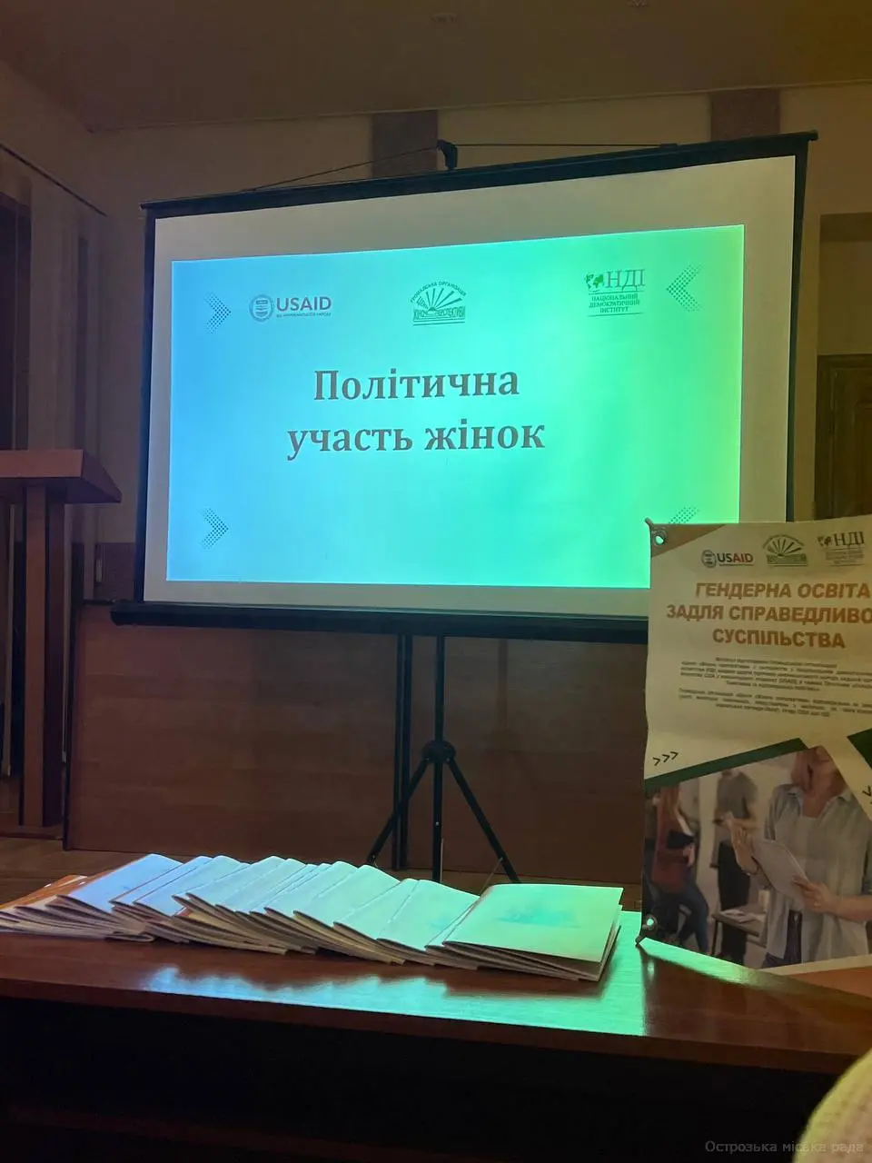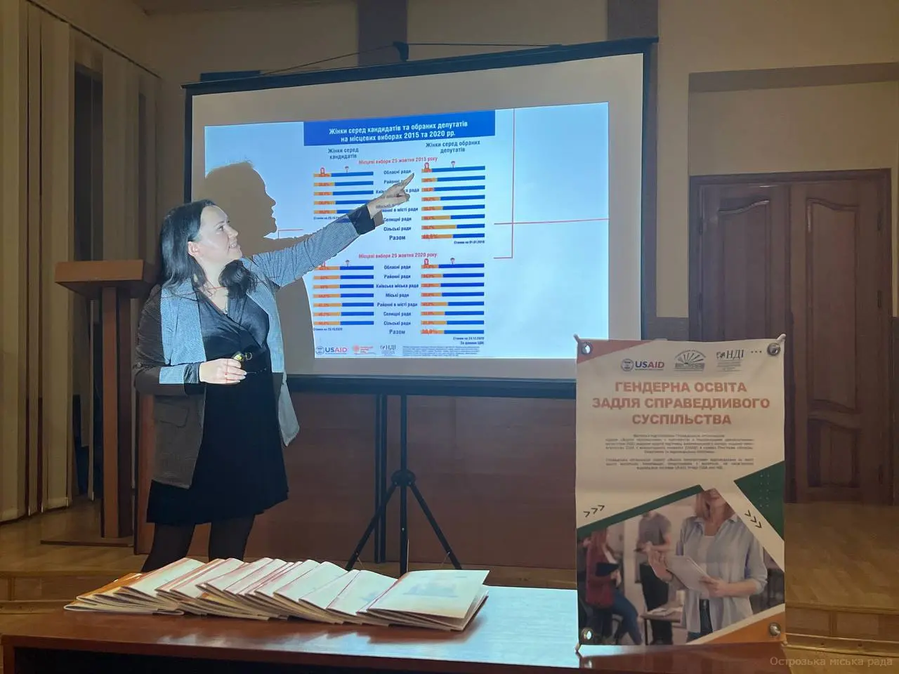 На заході були представлені статистичні дані у формі слайдів щодо участі жінок у політиці і як вони змінилися з 2015 року порівняно з 2020 роком.