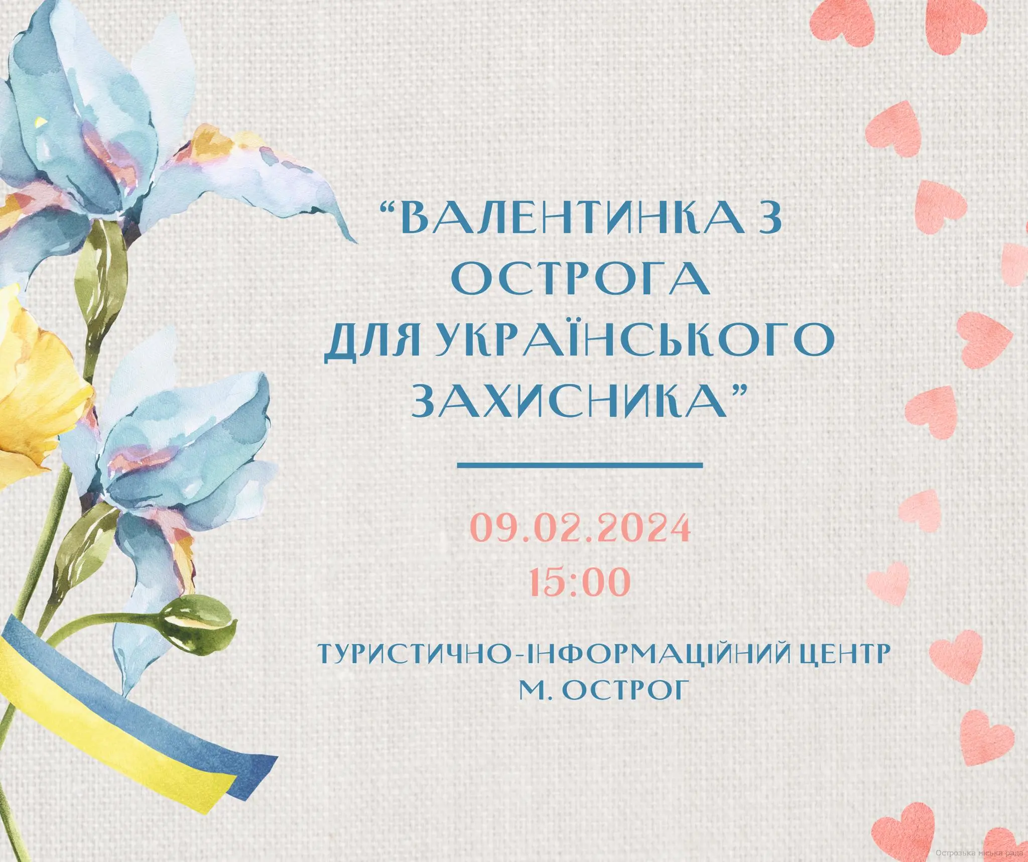 У пʼятницю, тобто завтра, приходьте у Туристично-інформаційний центр м. Острог і прийміть участь в акції «Валентинка з Острога для українського Захисника». Запрошуємо дітей і дорослих!