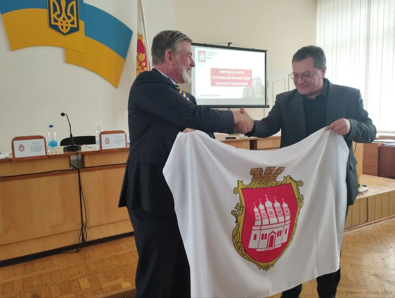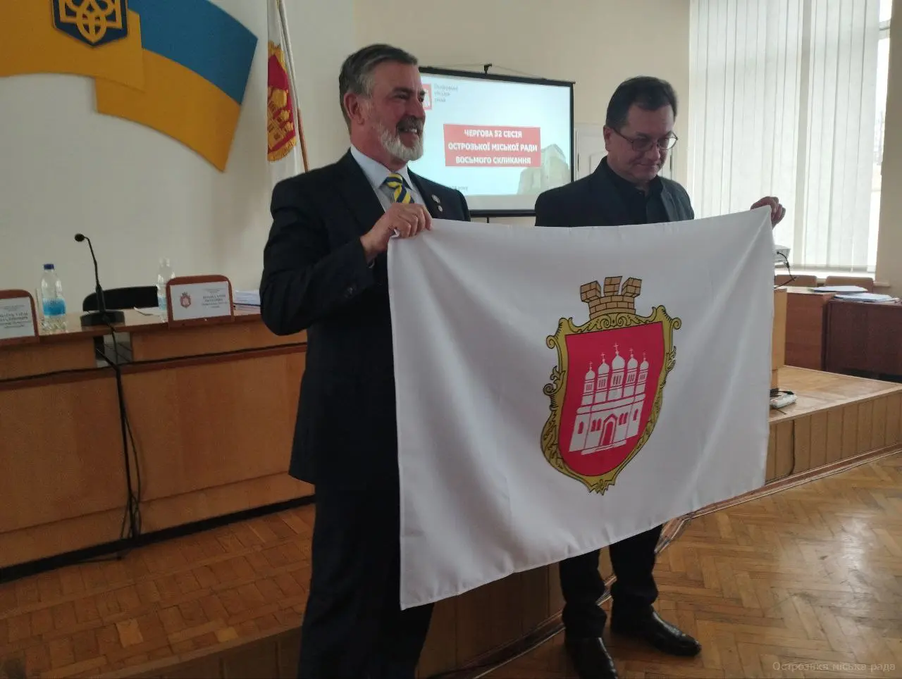 Міський голова Юрій ЯГОДКА, в знак вдячності передав Стіву Паттерсону  Прапор Острога  та  висловив  сподівання на плідну та тісну співпрацю між містами.