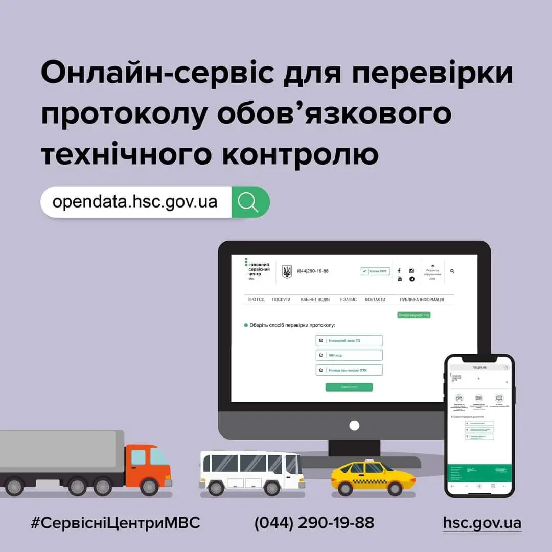 Головний сервісний центр МВС постійно працює над впровадженням інноваційних рішень для підвищення прозорості та доступності інформації. Відтак, запроваджено онлайн-сервіс з перевірки протоколу обов’язкового технічного контролю транспортних засобів, які здійснюють вантажні, комерційні та громадські перевезення. Мова йде про автобуси, маршрутки, служби таксі, вантажівки тощо.