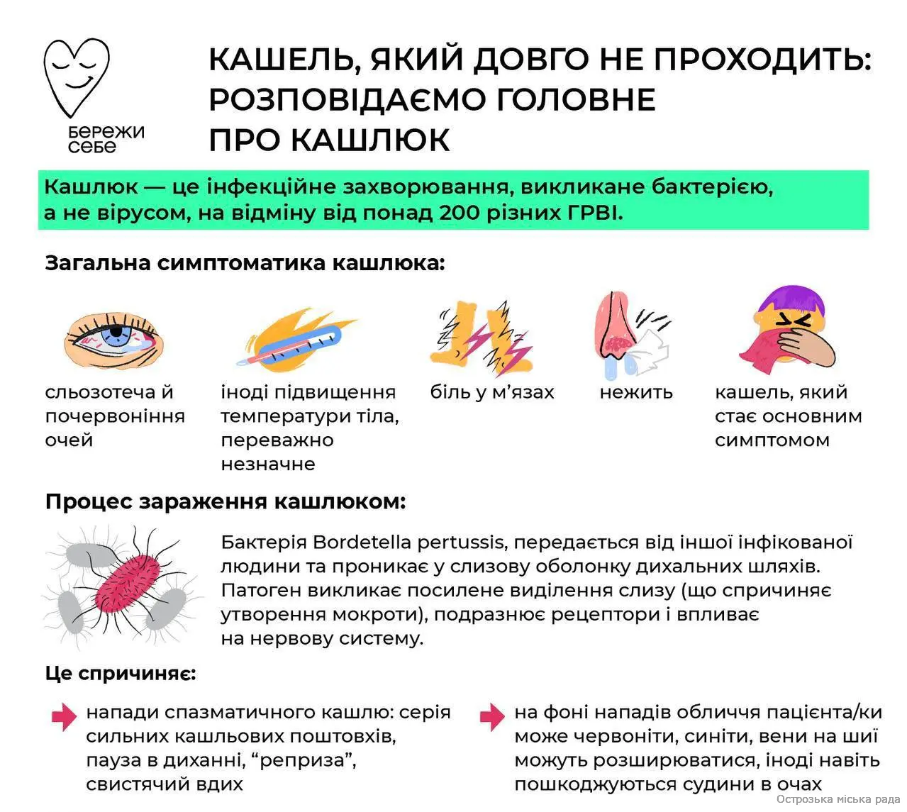 Кашлюк – це вкрай заразне захворювання дихальних шляхів, викликане бактерією. Кашлюк легко поширюється від людини до людини, головним чином повітряно-крапельним шляхом при кашлі чи чханні. Багато дітей, які заразилися кашлюком, страждають від нападів кашлю протягом 4-8 тижнів. Найбільш небезпечне це захворювання для немовлят.