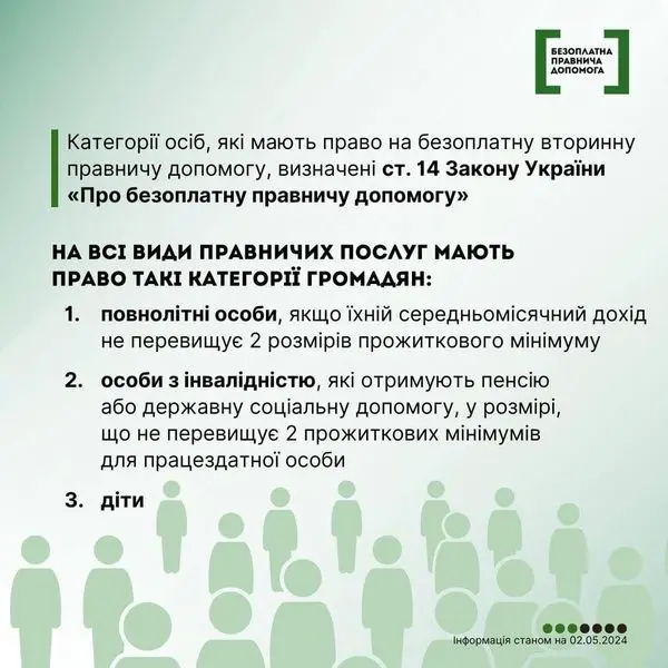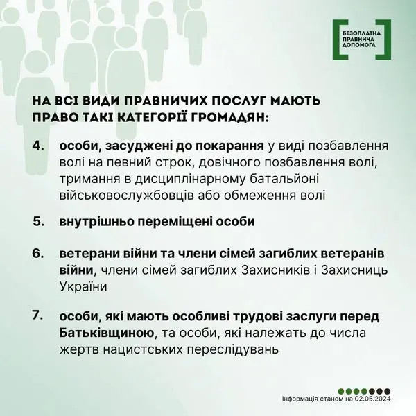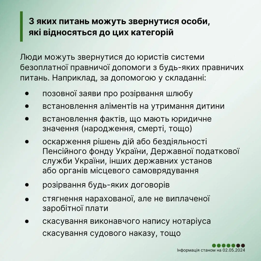 Детальніше про категорії осіб, які мають право на БВПД з усіх правничих питань — в картках.