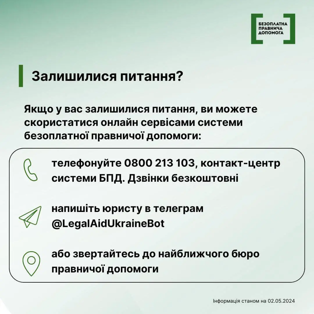 0 800 213 103 Контакт-центр системи безоплатної правничої допомоги (будні з 8:00 до 18:00) Дзвінки зі стаціонарних та мобільних телефонів у межах України безкоштовні.