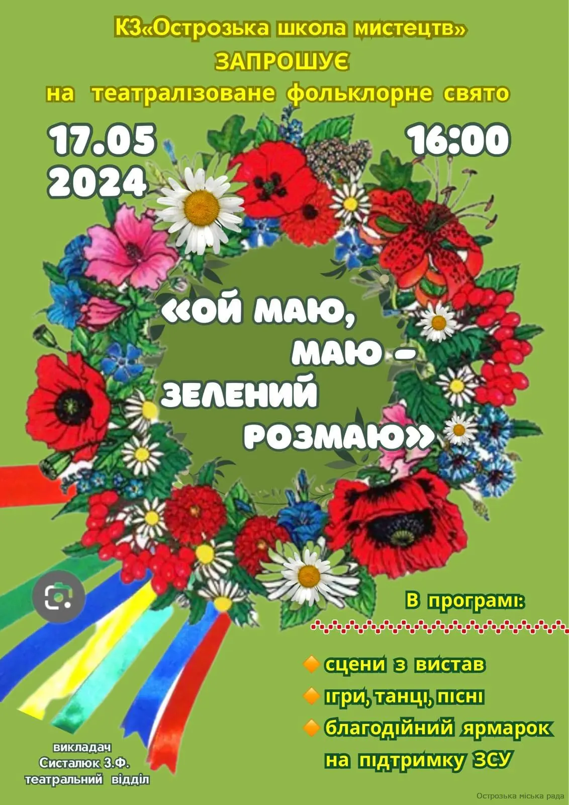 КЗ "Острозька школа мистецтв" запрошує на театралізоване фольклорне свято "Ой маю, маю - зелений розмаю"