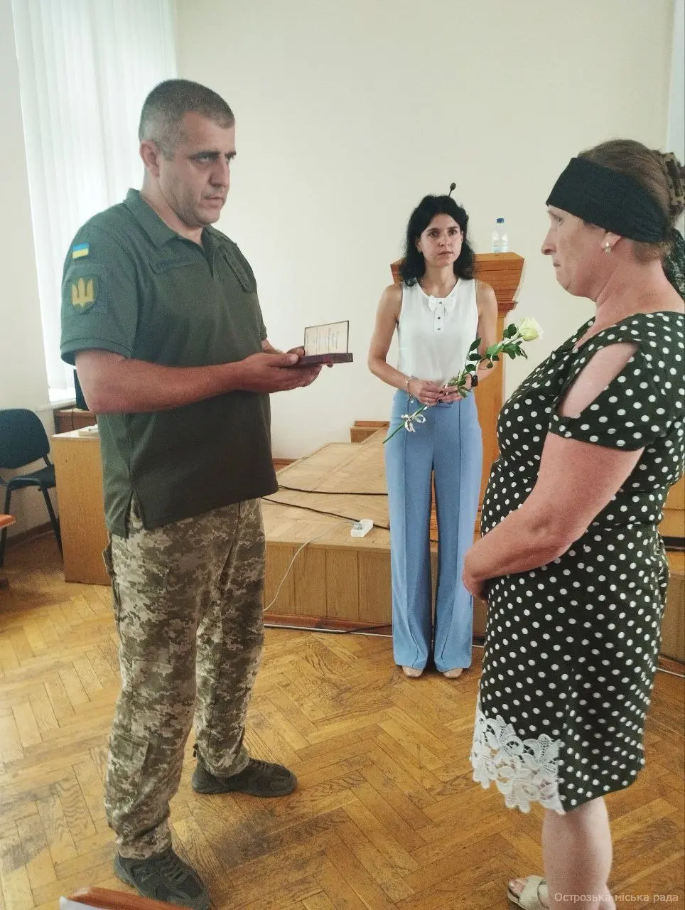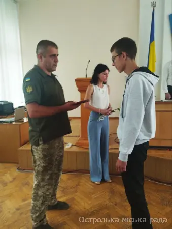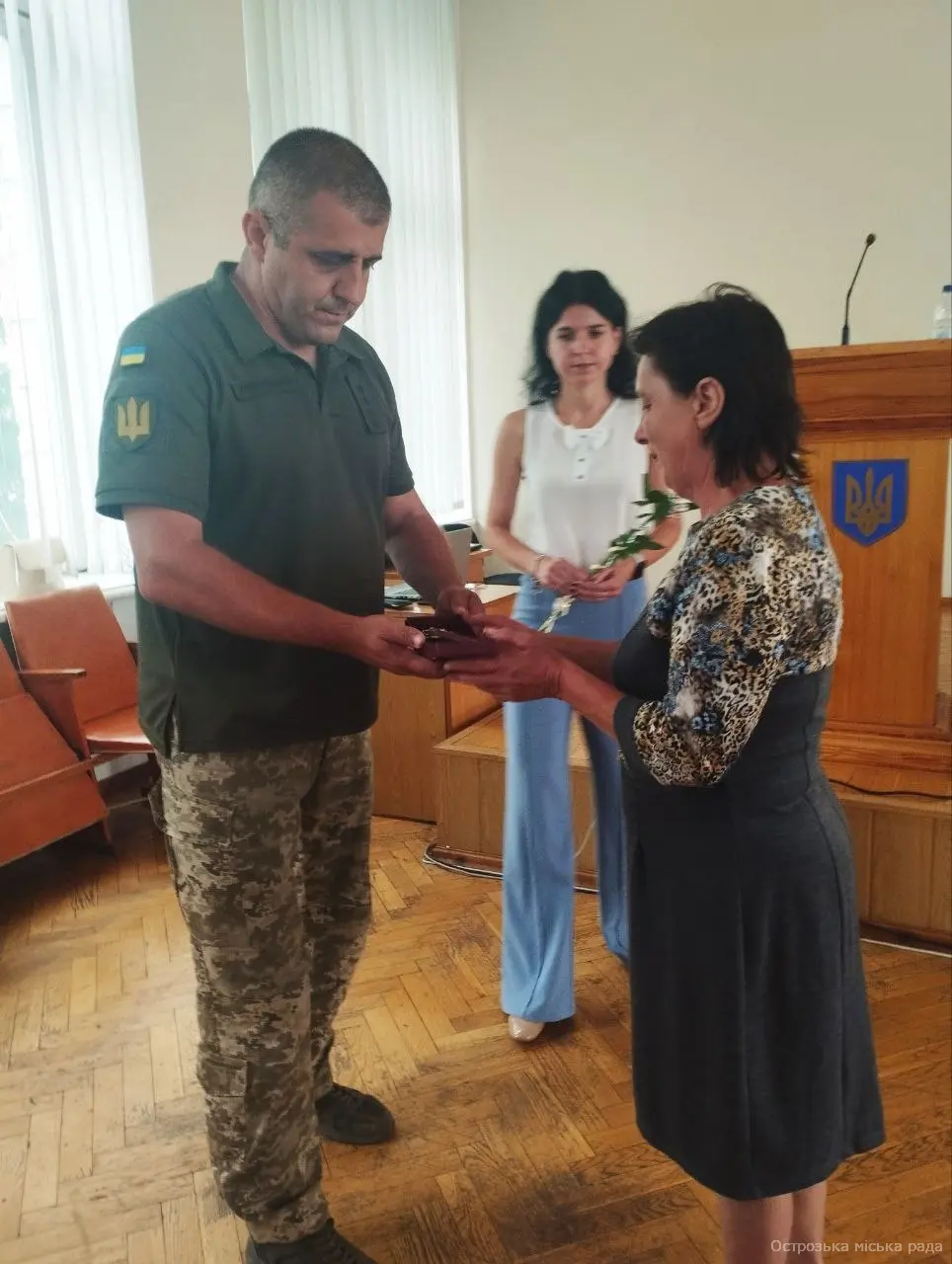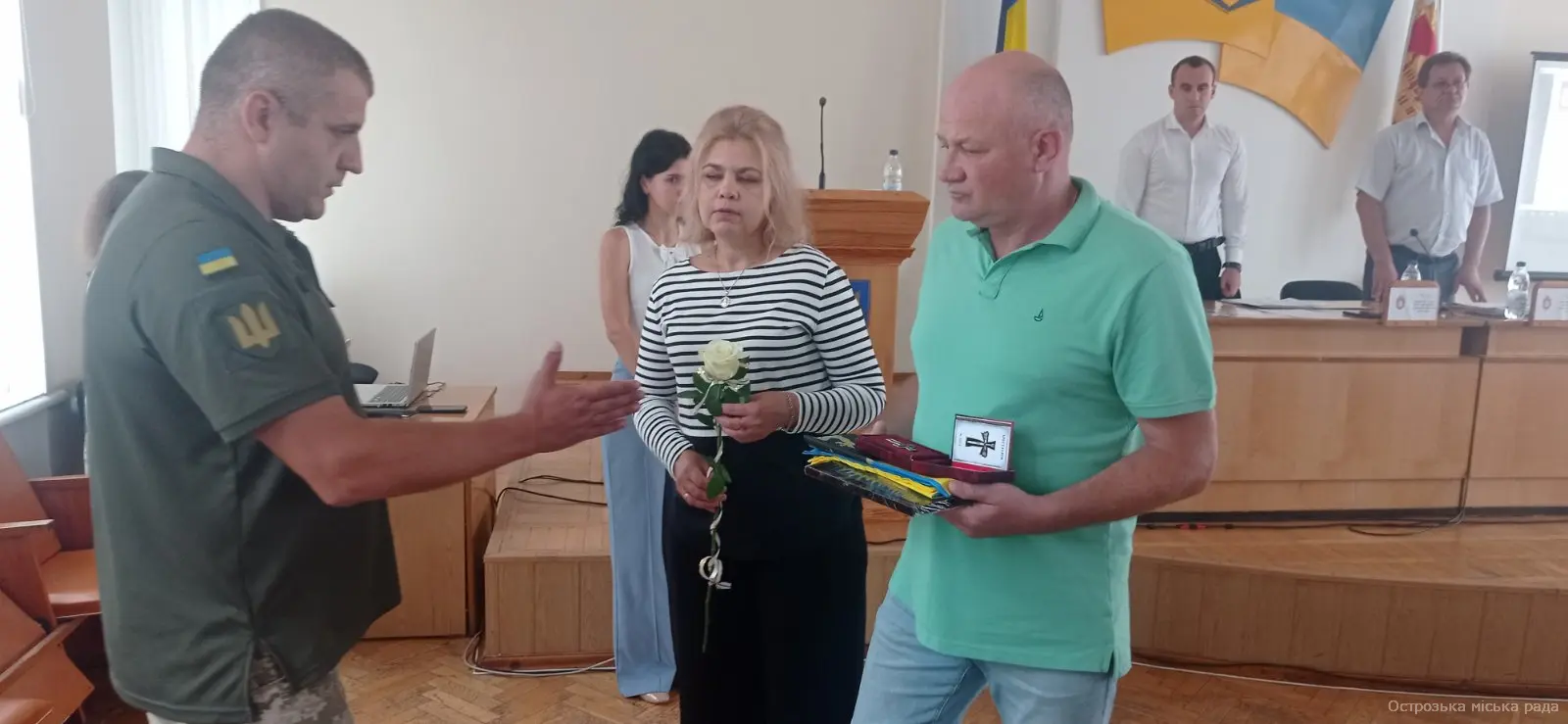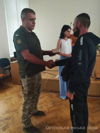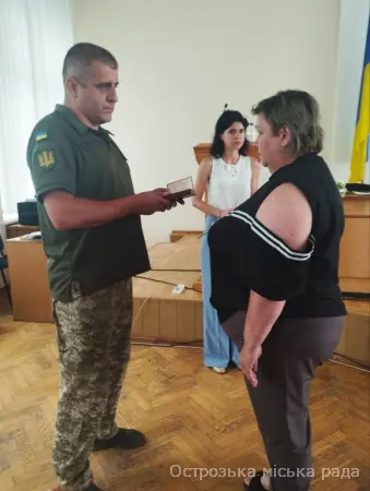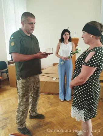 На початку засіданні сесії, Острозький міський голова Юрій Ягодка разом з старшим офіцером Шостого відділу Рівненського РТЦК та СП Леонідом Рубанським виконали почесну і водночас сумну місію – вручили посмертні державні нагороди родинам загиблих військовослужбовців.