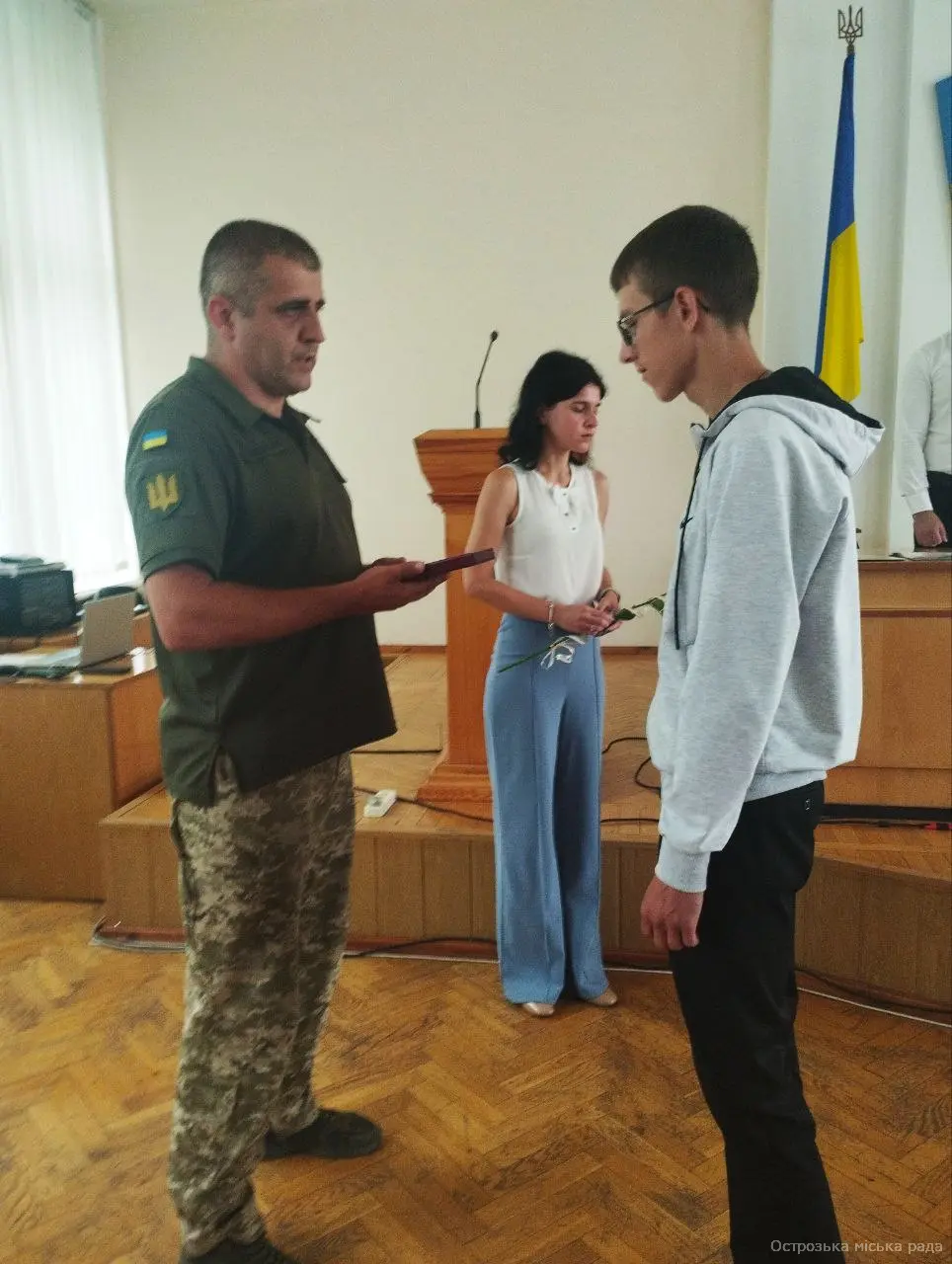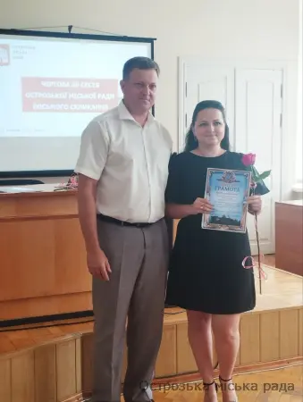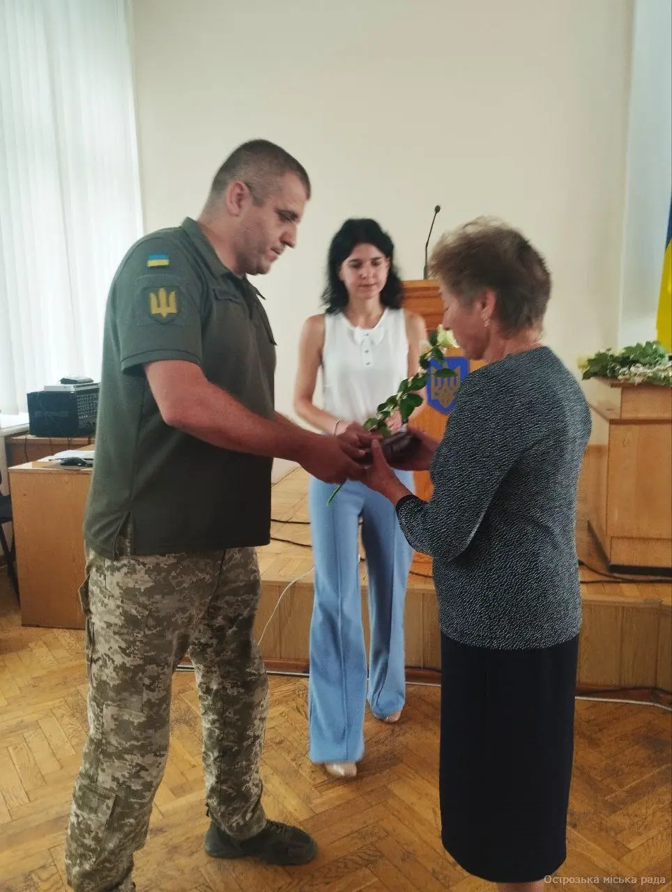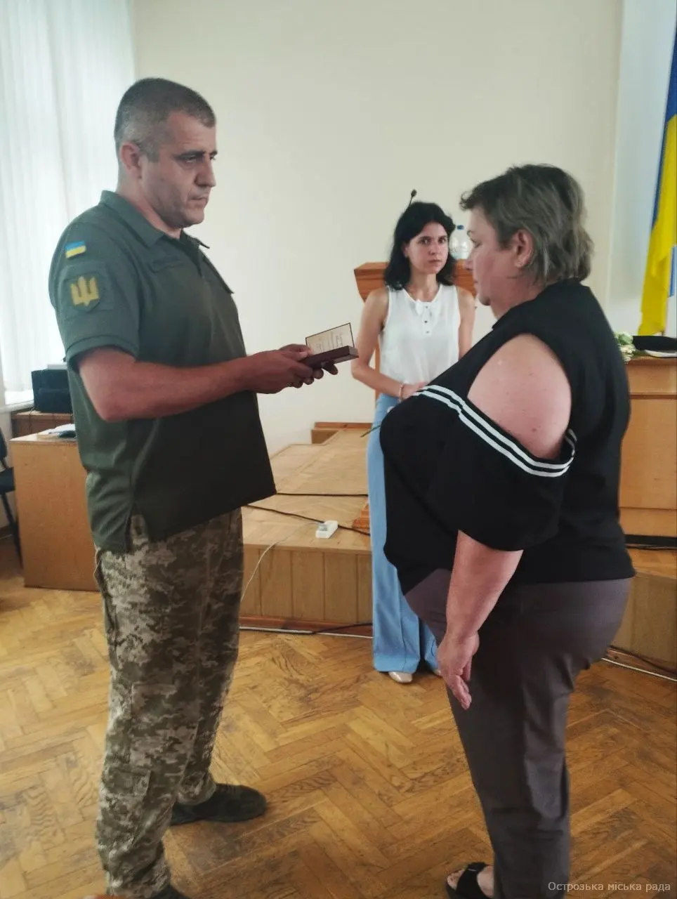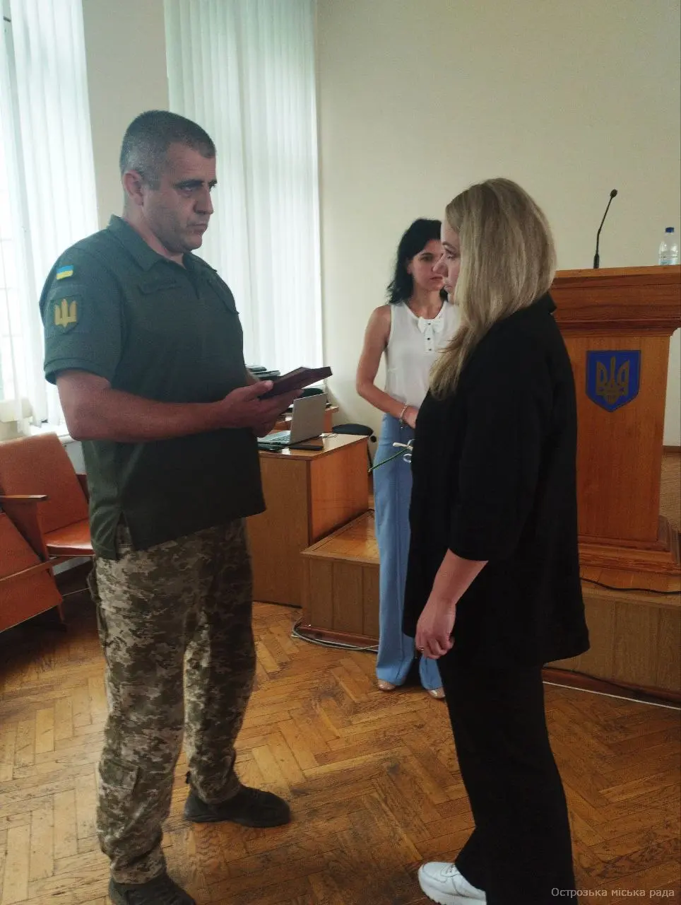 На початку засіданні сесії, Острозький міський голова Юрій Ягодка разом з старшим офіцером Шостого відділу Рівненського РТЦК та СП Леонідом Рубанським виконали почесну і водночас сумну місію – вручили посмертні державні нагороди родинам загиблих військовослужбовців.