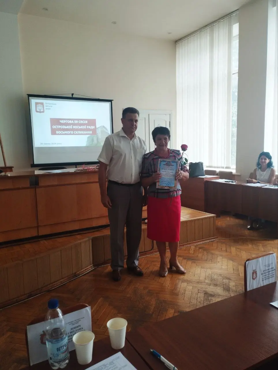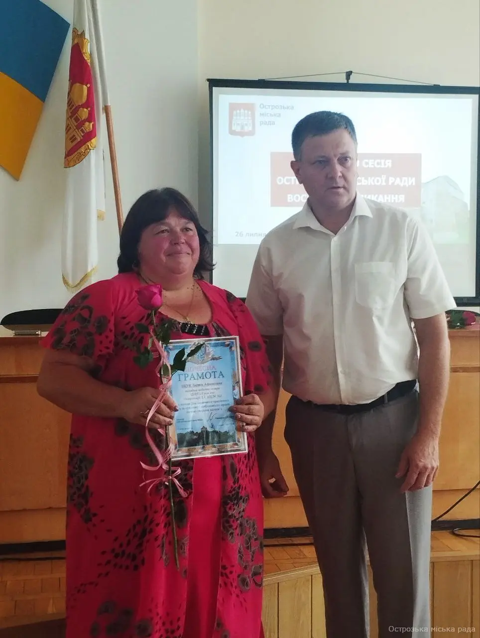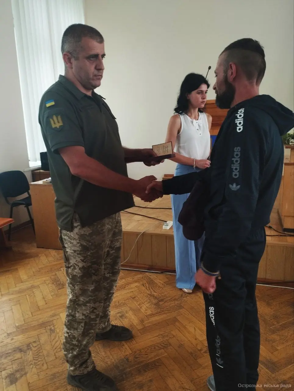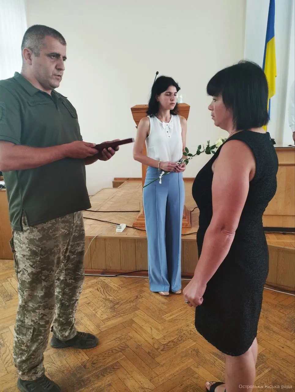 На початку засіданні сесії, Острозький міський голова Юрій Ягодка разом з старшим офіцером Шостого відділу Рівненського РТЦК та СП Леонідом Рубанським виконали почесну і водночас сумну місію – вручили посмертні державні нагороди родинам загиблих військовослужбовців.