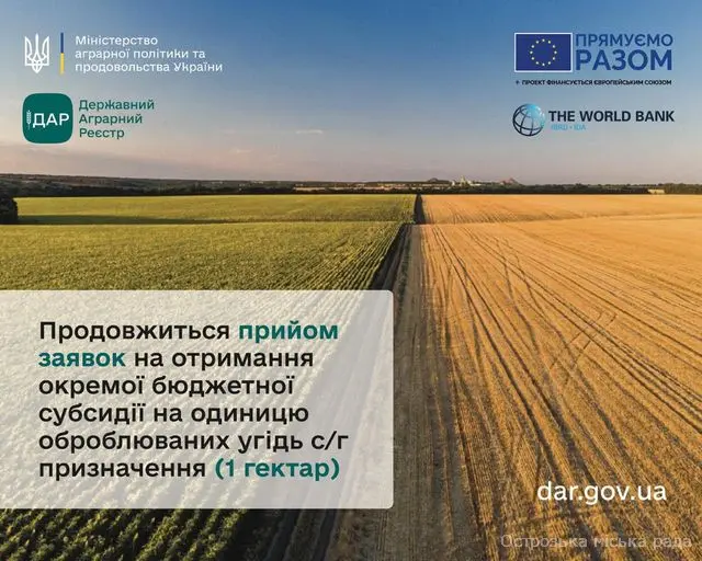 З 20 серпня 2024 року в ДАР буде поновлено прийом заявок на отримання бюджетної субсидії на одиницю оброблюваних угідь (1 гектар) для провадження сільськогосподарської діяльності.Субсидія, розміром 4000 грн на 1 га, доступна виробникам сільськогосподарської продукції, які мають у власності або користуванні до 120 га земель сільськогосппризначення.