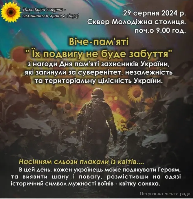 29 серпня 2024 року, в Сквері "Молодіжна столиця" о 09.00 годині відбудеться Віче-пам'яті "Їх подвину не буде забуття!" з нагоди Дня пам'яті захисників України, які загинули за суверенітет, незележність та територіальну цілісність України.