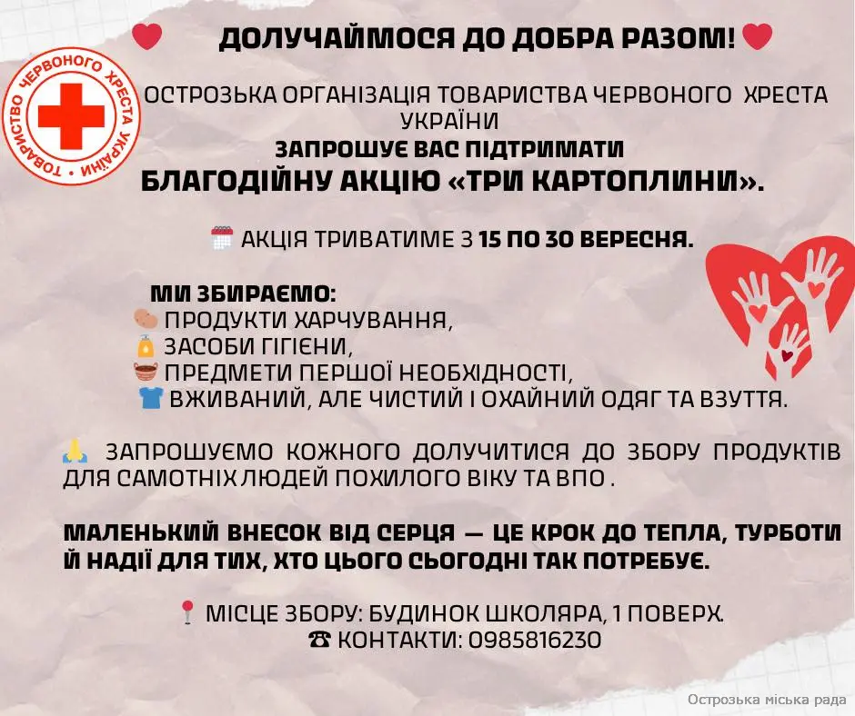 Острозька організація Товариства Червоного Хреста України запрошує підтримати благодійну акцію «Три картоплини», що триває по 30 вересня.
