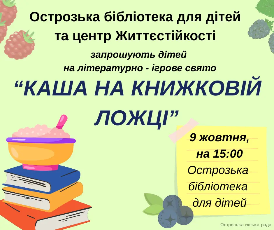 Острозька бібліотека для дітей спільно з центром Життєстійкості щиро запрошують дітей на захоплююче літературно-ігрове свято під назвою: "Каша на книжковій ложці"