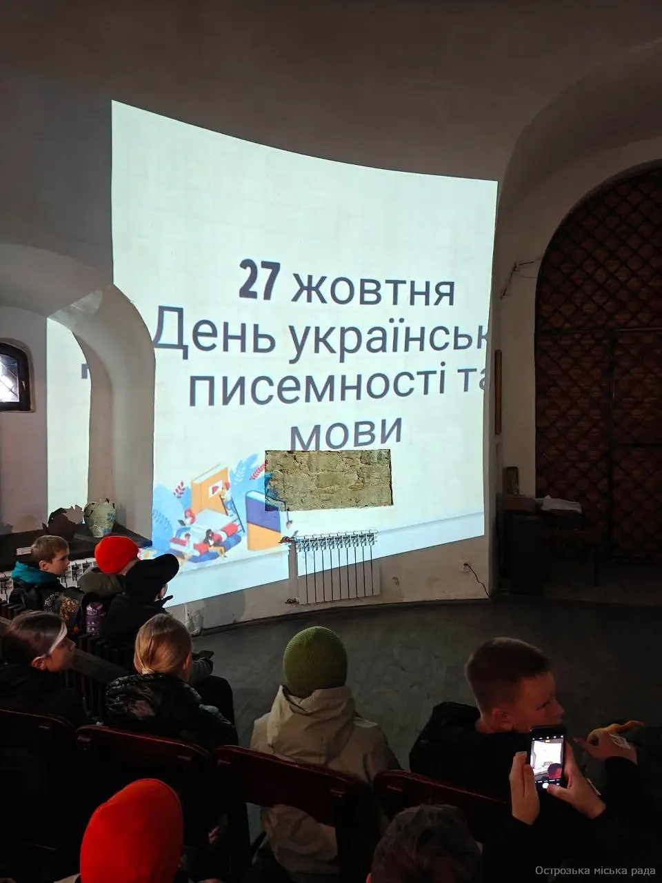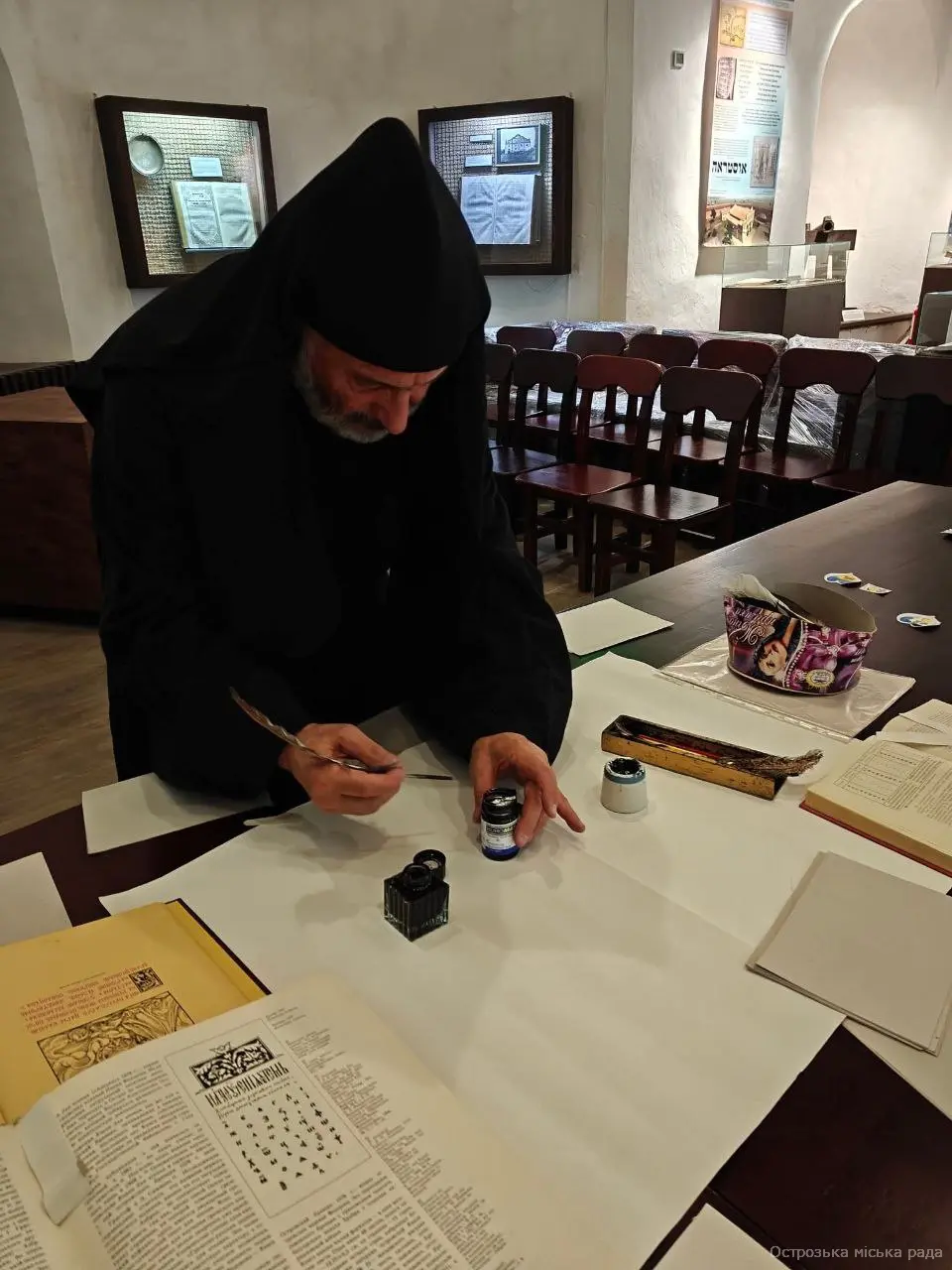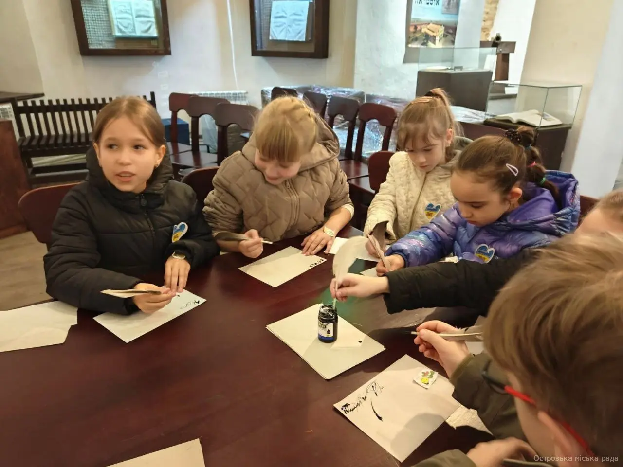 Напередодні відзначення Дня  української писемності та мови  центральна бібліотека разом з музеєм  книги та друкарства організували  учням 4 класу Острозького ліцею №2 (класний керівник Чайка Г.А.)  інтерактивну екскурсію та виховну годину «Душа голосна України!». Розпочала захід бібліотекар Валентина Ліщук, яка розповіла про важливість та значення цієї зустрічі. Анатолій Хеленюк в образі монаха оповів дітям  історію свята,  Нестора-Літописця, Кирила і Мефодія. Бібліотекарі  провели вікторину «Мовне асорті»,  флешмоб «Ми любимо українську мову» та подарували наклейки з надписом «Говориш українською мовою? Так». На завершення учні спробували писати гусячим пером і чорнилом.