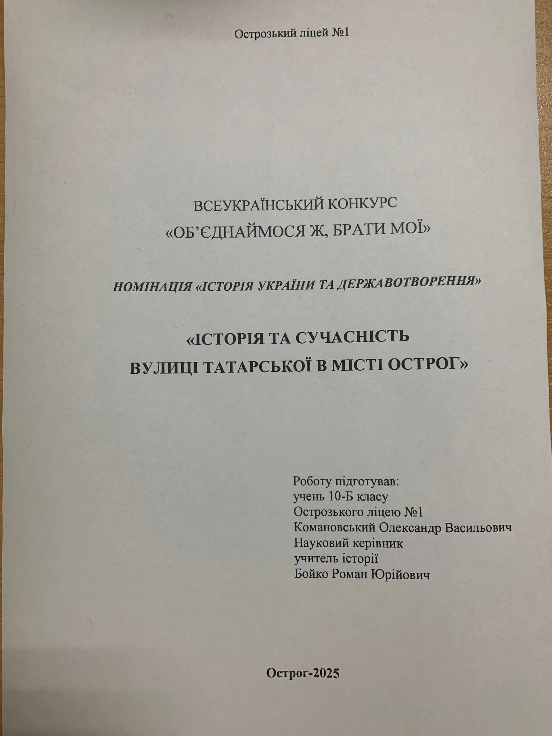 Олександр КОМАНОВСЬКИЙ, учень 10 класу Острозького ліцею № 1, з роботою «Історія та сучасність вулиці Татарської в місті Острозі», керівник – Роман БОЙКО;