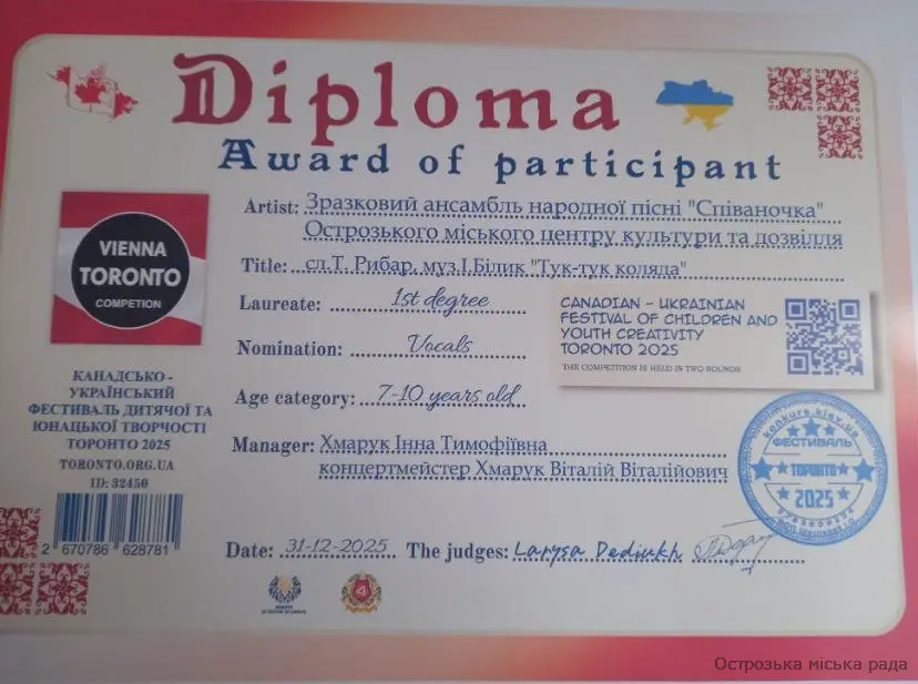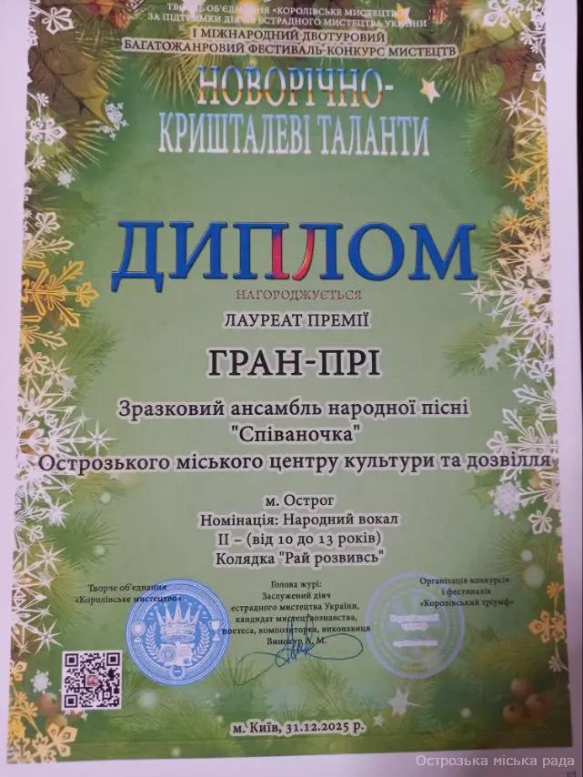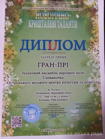 Зразковий ансамбль народної пісні "Співаночка" (старша група) КЗ "Центр культури дозвілля і туризму" Острозької міської ради з нагороджено дипломом лауреата премії ГРАН-ПРІ у І Міжнародному двотуровому багатожанровому фестивалі-конкурсі мистецтв "Новорічно-кришталеві таланти", м. Київ. У номінації «Народний вокал» Також Зразковий ансамбль народної пісні "Співаночка" (молодша група) КЗ "Центр культури дозвілля і туризму" Острозької міської ради здобув диплом лауреата I ступеня канадсько-українського фестивалю дитячої та юнацької творчості Торонто 2025 у номінації «Вокал» Щиро вітаємо керівника колективу Хмарук Інну Тимофіївну, концертмейстра Хмарука Віталія Віталійовича, учасників колективів та їх батьків з престижними нагородами. Зичимо подальших успіхів, натхнення й наснаги у творчості. Кожна перемога культурної галузі - твердий доказ глибини й цінності України, імпульс віри в перемогу, крок до неї!!!