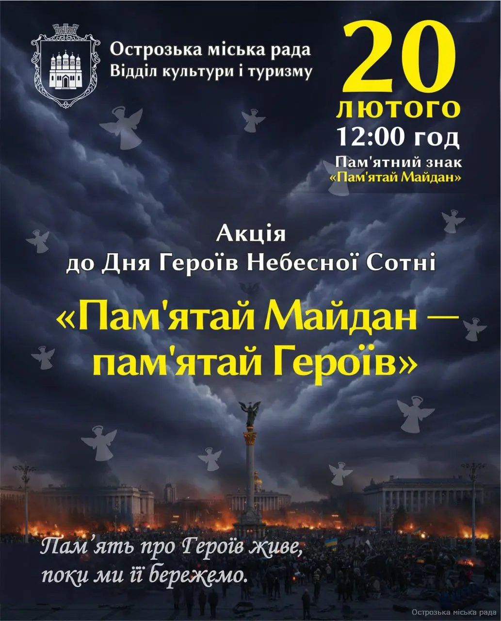 20 лютого Україна вшановує пам’ять Героїв Небесної Сотні — тих, хто віддав своє життя за свободу, гідність і майбутнє нашої держави під час подій Революція Гідності. Запрошуємо долучитися до акції «Пам’ятай Майдан — пам’ятай Героїв», щоб разом схилити голови у скорботі, запалити свічки пам’яті та згадати подвиг тих, хто назавжди залишився у строю Небесної Сотні. Місце проведення: пам'ятний знак "Пам'ятай Майдан" Час: 12:00 год Дата: 20 лютого Нехай наша присутність стане знаком вдячності й шани. Пам’ять про Героїв живе, поки ми її бережемо. Герої не вмирають!