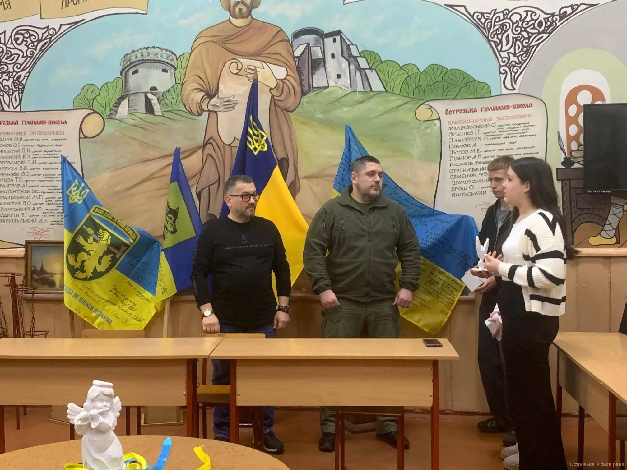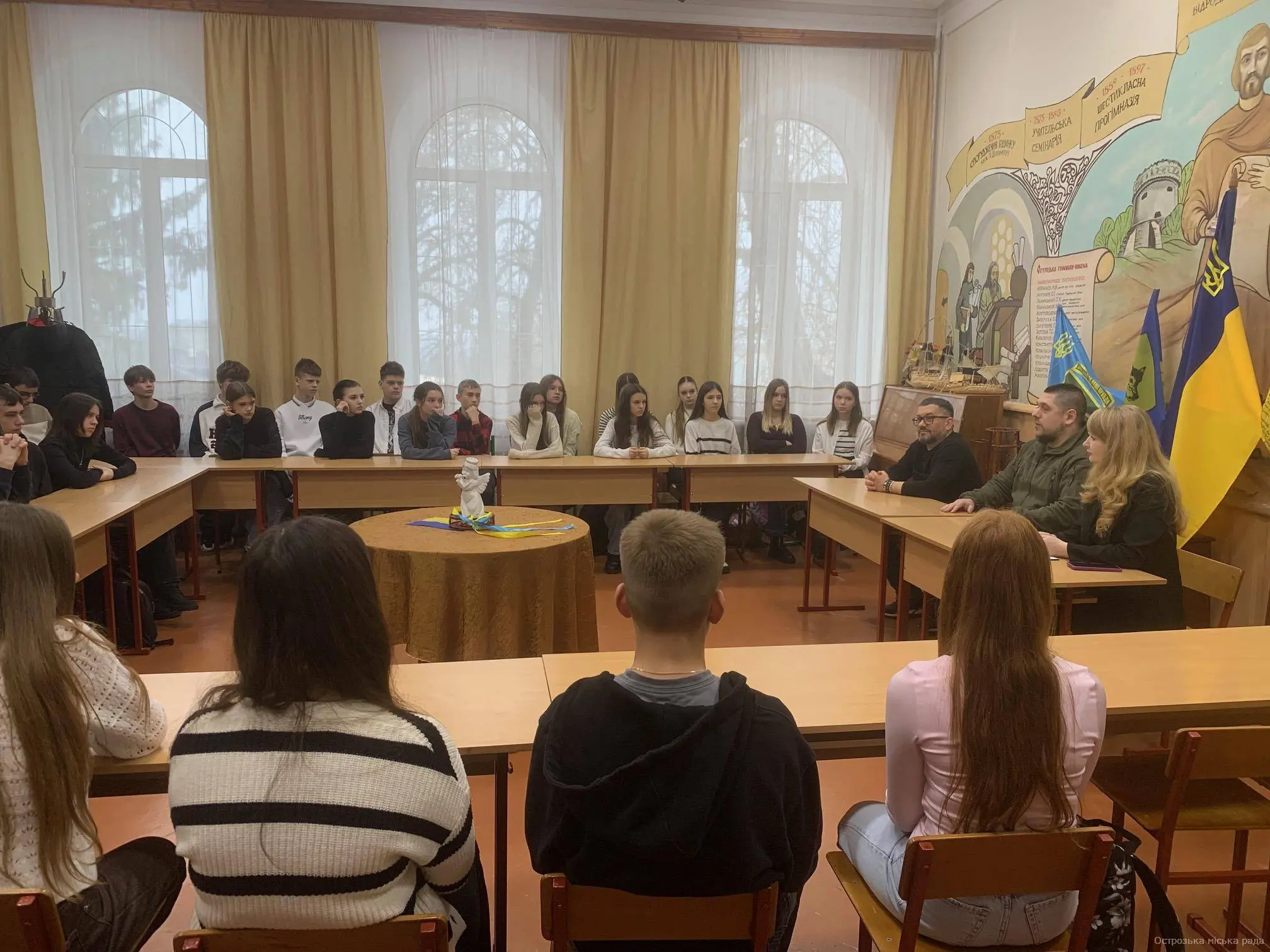 В Острозькому ліцеї №2 відбулася відкрита розмова «Сила України – в її людях», приурочена 4-ій річниці повномасштабного вторгнення росії в Україну. На захід були запрошені почесні гості - голова ради ветеранів Острозької громади, учасник бойових дій, ветеран війни Михайло КАНЦЕДАЛ та учасник бойових дій, ветеран війни Ігор ХНИКІН. Під час щирої розмови з учнями 8-А та 9-Б класів запрошені поділилися спогадами про початок війни, розповіли про свій шлях боротьби за Україну, про випробування та незламність українського духу. Головний меседж для молоді від наших Захисників - не стояти осторонь. Єдність, активна позиція, саморозвиток, сила характеру й духу - це те, що формує покоління, здатне зберегти й відновити Україну.