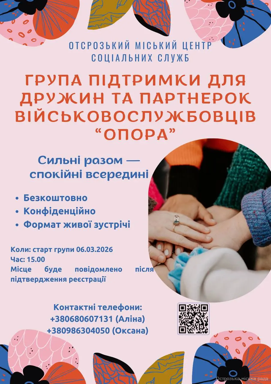 Острозький міський центр соціальних служб оголошує про початок роботи групи підтримки для дружин та партнерок військовослужбовців «Опора».