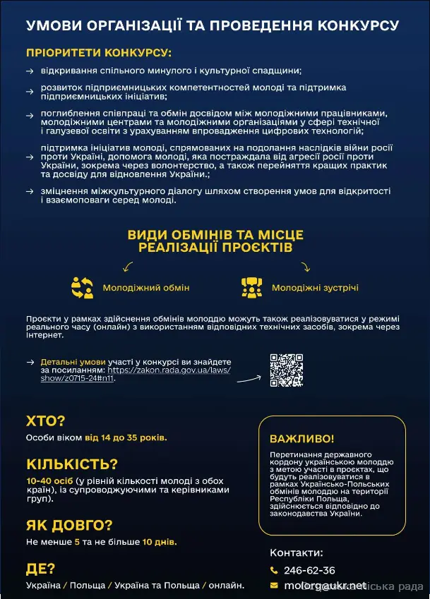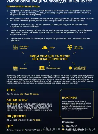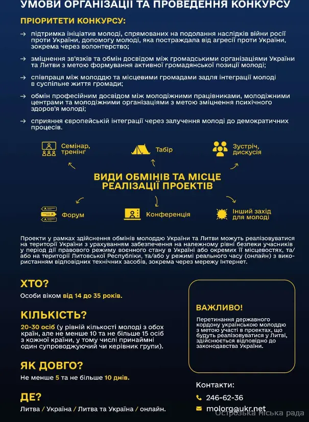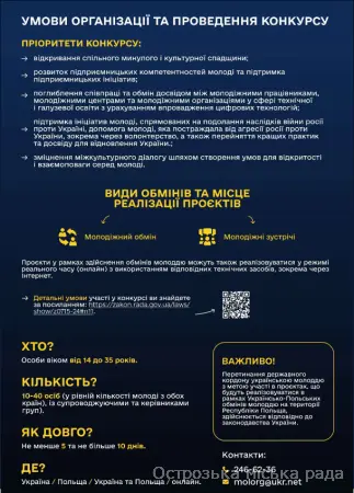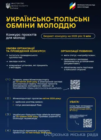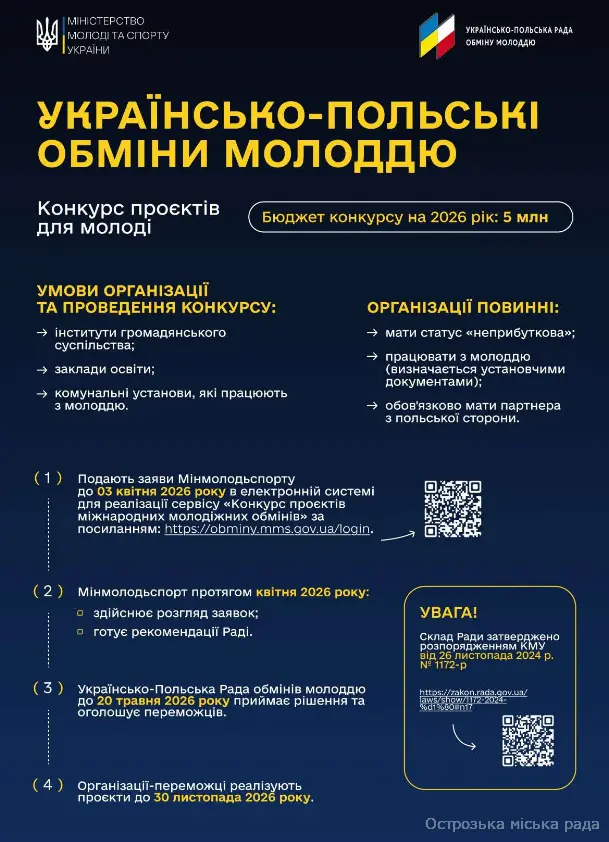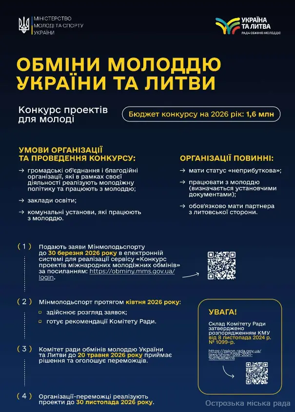 Також повідомляємо, що 05 березня 2026 року о 15:00 год. відбудеться вебінар щодо правил подання заявок на участь у конкурсах міжнародних молодіжних обмінів з Польщею та Литвою. Захід транслюватиметься на Facebook сторінці Управління молодіжної політики, а також на сторінках ICAP Єднання у Facebook та YouTube за посиланням.
