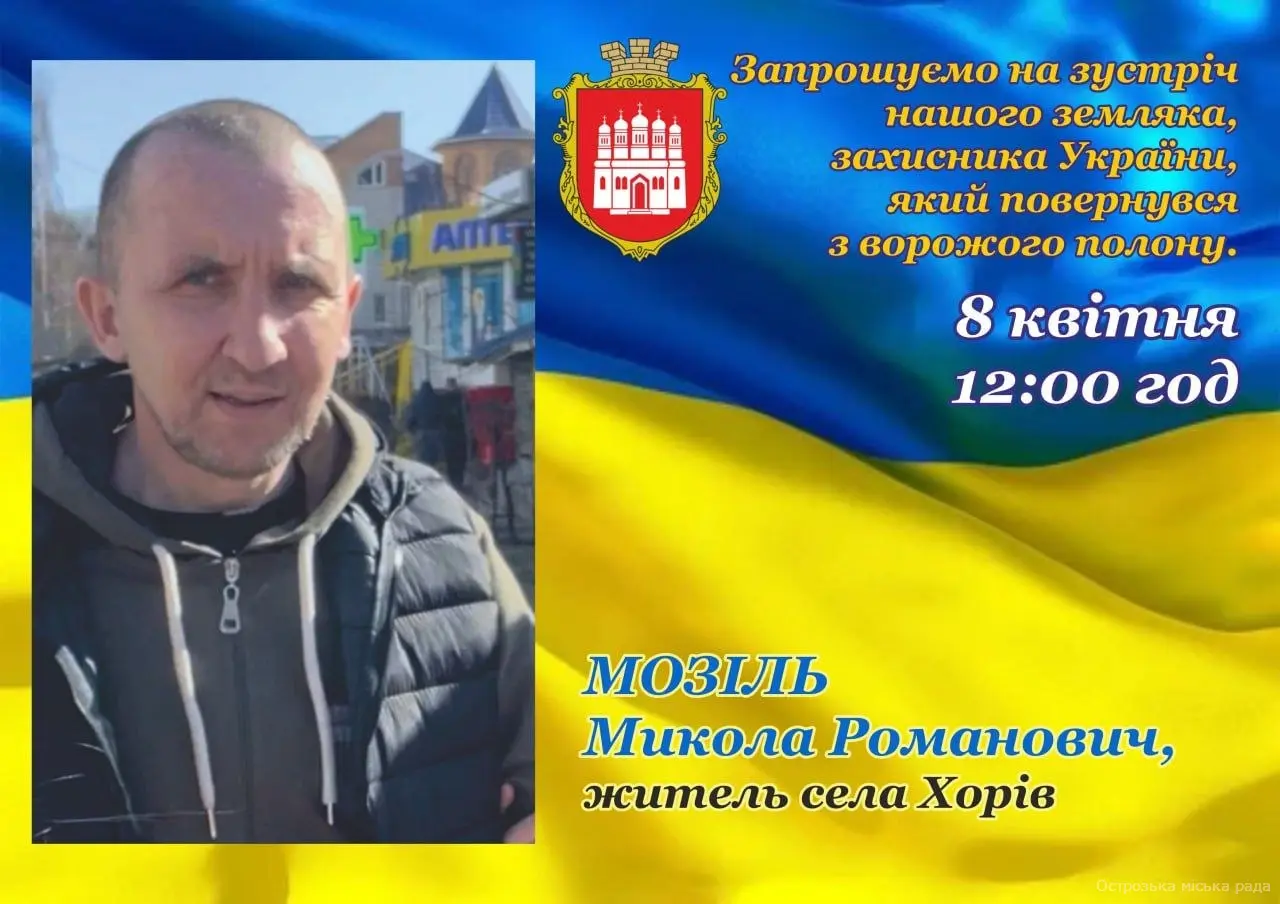 Запрошуємо острожан долучитись до радісної події - зустрічі звільненого з полону земляка. Микола Мозіль, мешканець с.Хорів, був у неволі понад два роки. Завтра він повертається на Острожчину. Просимо долучитись до урочистої миті зустрічі 8 квітня, о 12.00 в Будинку культури.