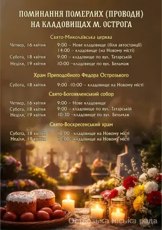 Розклад відправ за померлими (проводів) на кладовищах Острога буде таким: