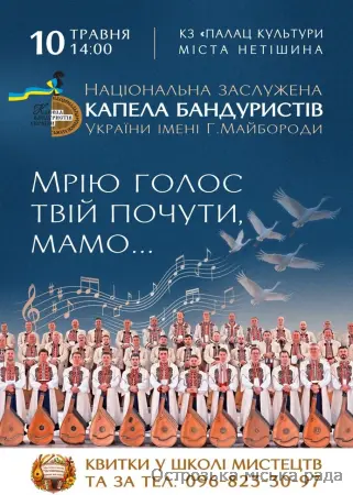Шановні жителі та гості громади! Запрошуємо вас на визначну культурну подію — святковий концерт до Дня матері за участю легендарного колективу — Національної заслуженої капели бандуристів України імені Г.І. Майбороди.Це вечір, де велич українського слова поєднається з магічним звучанням десятків бандур та мужніми голосами, щоб ушанувати найдорожчих — наших матерів. У програмі заходу: шедеври української класики, народні пісні та сучасні твори у неповторному виконанні.Дата проведення: 10 Травня